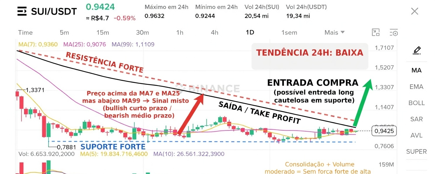 - Preço está acima da MA7 (0,9360) e da MA25 (0,9076) → pequeno suporte de curto prazo e sinal levemente bullish no curtíssimo prazo.