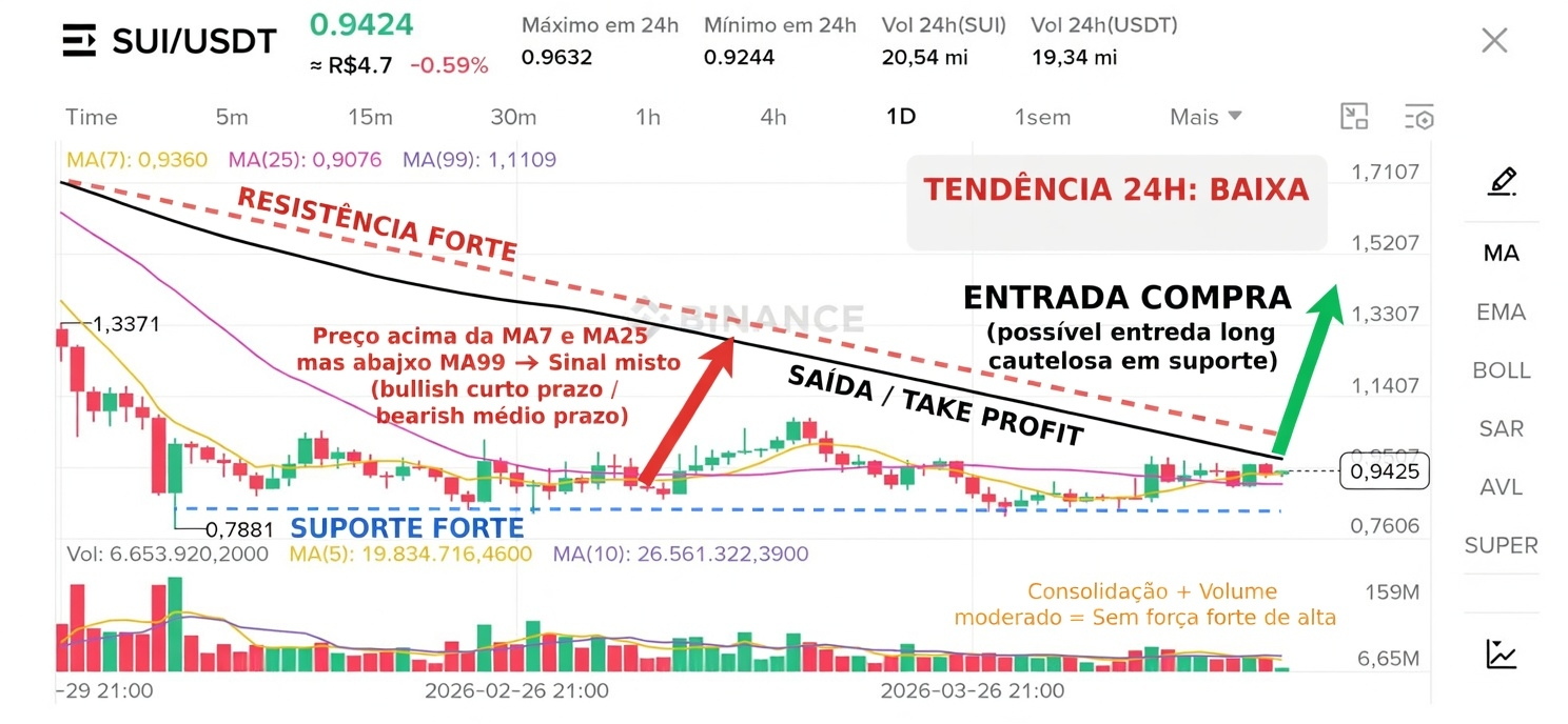 - Volume 24h está moderado (20,54 mi SUI), sem picos de compra agressiva. Os últimos candles mostram corpos pequenos com mistura de verdes e vermelhos, indicando indecisão + falta de convicção dos compradores.