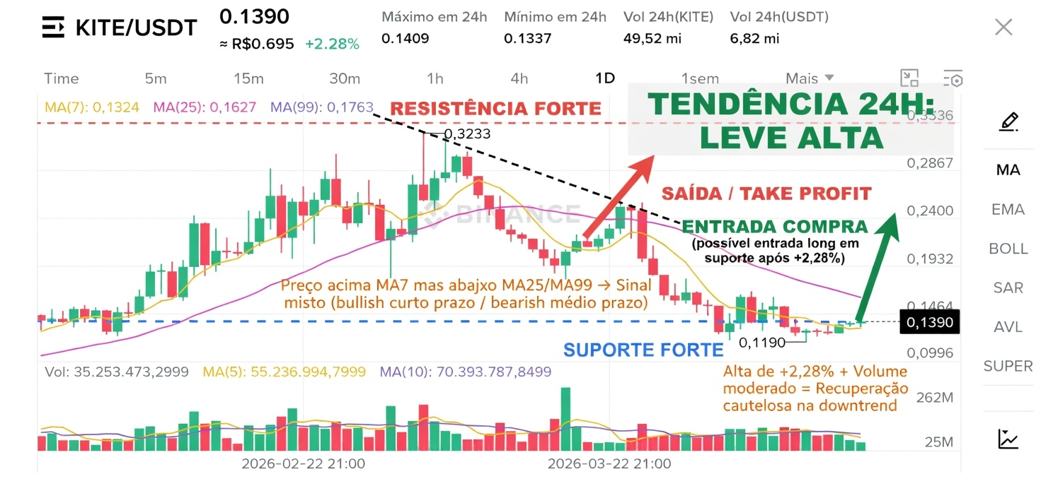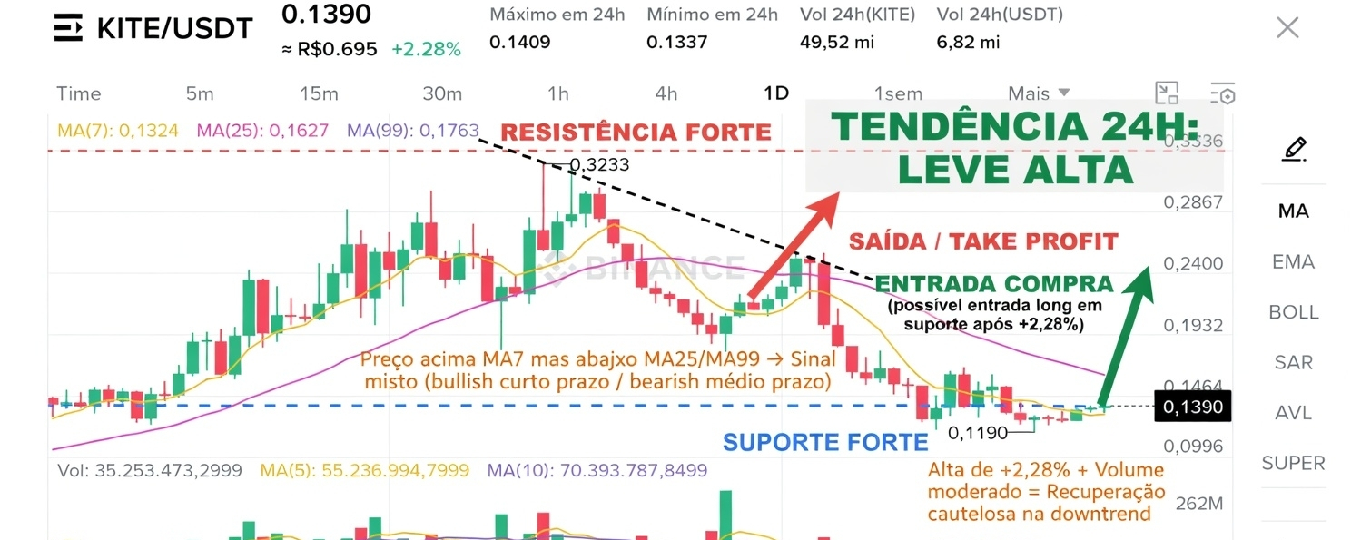 - Entrada: Agora ou em qualquer pullback que segure a zona 0,1337–0,1390 (suporte atual da MA7). Confirme com candle verde forte + volume crescente.