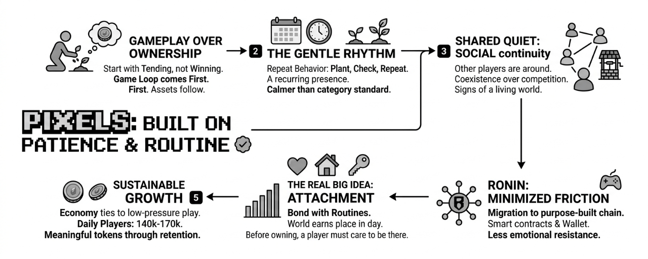 If every interaction reminds you of the machinery underneath, the spell breaks. If every step feels like a transaction instead of a routine, the world stops feeling like a world. Pixels seems strongest when that underlying structure stays in the background and lets the player focus on time, place, and repetition. That is not glamorous, but it’s probably what makes the whole thing work.