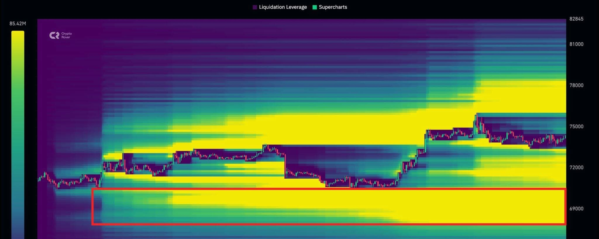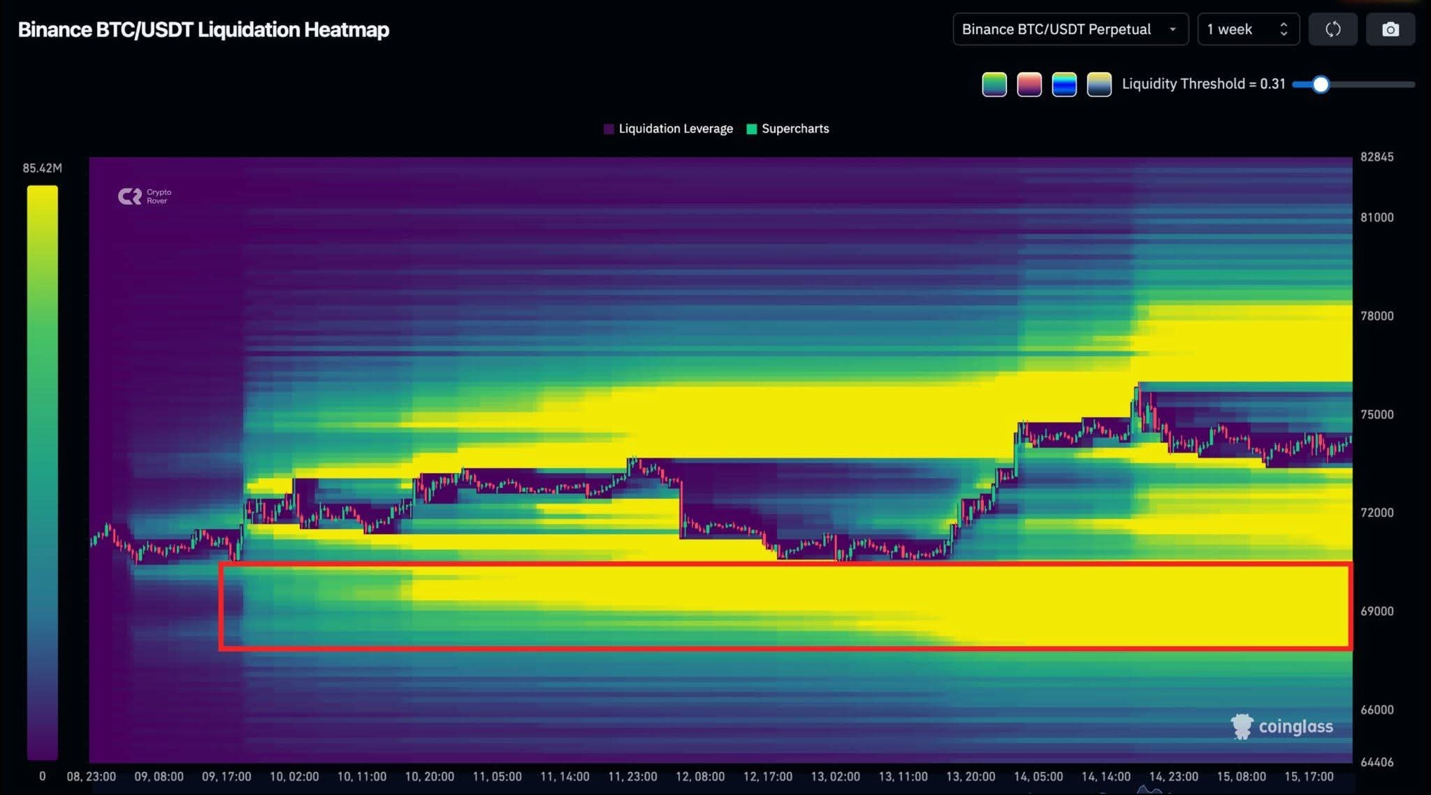 Tập trung vào vùng được khoanh đỏ chữ nhật trên biểu đồ. Đó là một dải thanh khoản màu vàng rực rỡ, đặc quánh trải dài từ mốc 68.000$ đến 70.000$.