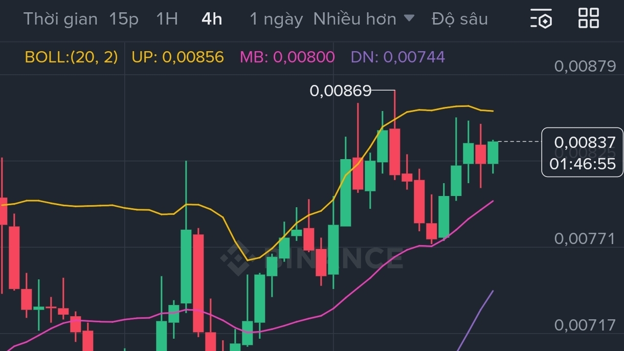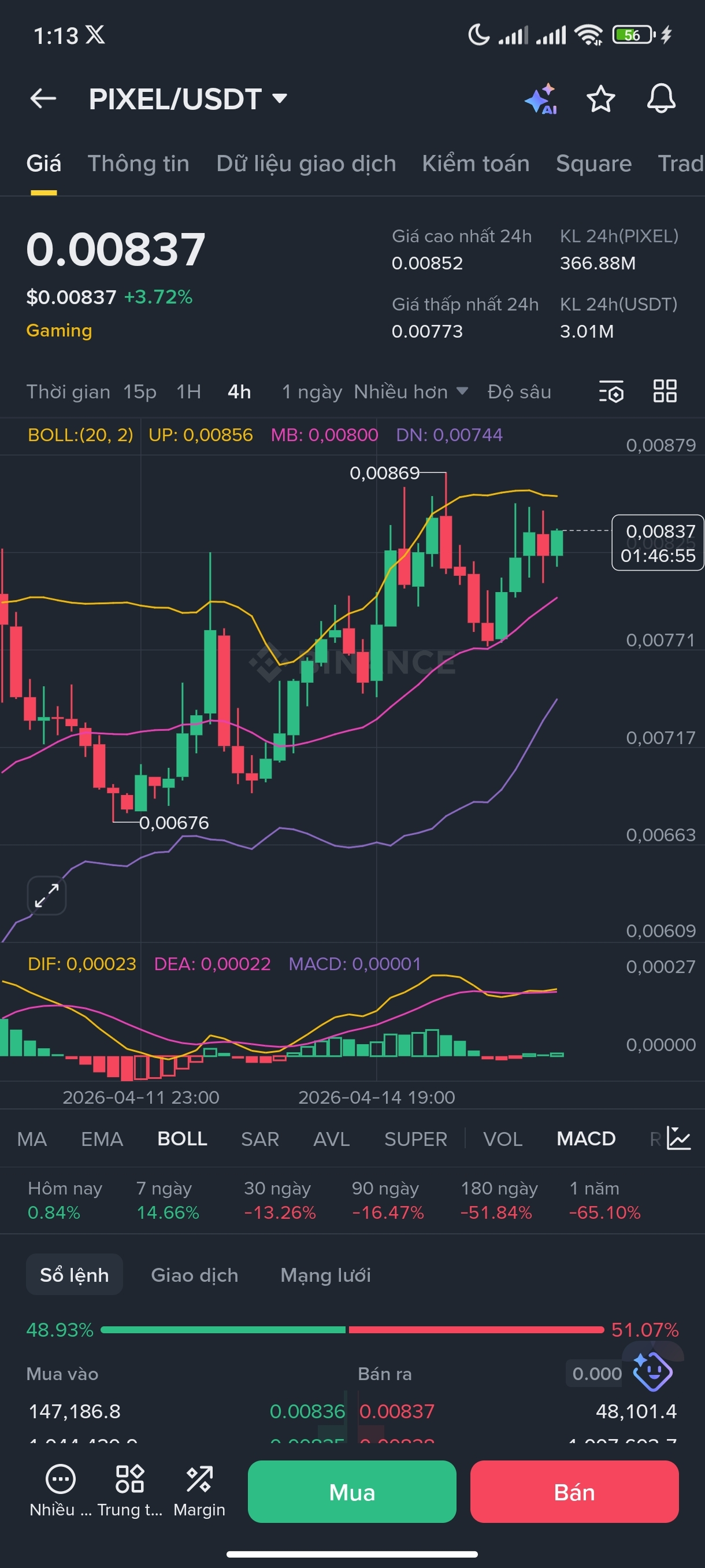 Nhìn chart PIXEL 4H trên Binance: giá vẫn nằm trên các đường EMA chính, cho thấy cấu trúc bullish chưa bị phá vỡ. RSI đã hạ nhiệt từ vùng overbought (71-75 mấy ngày trước) về mức neutral — đây là reset lành mạnh, tạo room cho đợt pump tiếp theo. MACD vẫn nằm trong vùng dương, histogram tuy thu hẹp nhưng chưa bearish crossover.