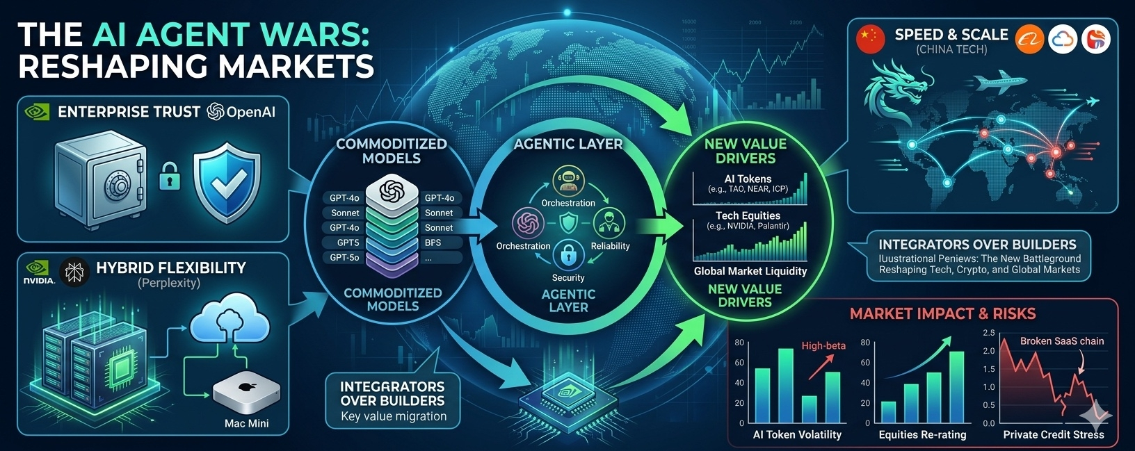 “This market brief examines the rapidly escalating AI agent platform war between OpenAI, Perplexity, NVIDIA, and Chinese tech firms… exploring investment implications across AI tokens, equities, and liquidity conditions.”