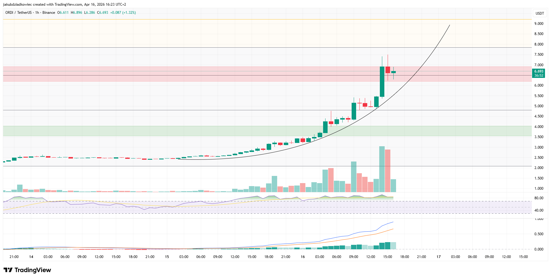 Từ ngày 13 tháng 4, ORDI đã theo dõi một đường cong tăng trưởng theo cấp số nhân màu đen, với mỗi cây nến đều thiết lập mức cao mới với tốc độ ngày càng tăng. Giá tăng mạnh vào ngày 16 tháng 4, tăng từ khoảng 2,50 đô la lên mức cao nhất là 6,896 đô la chỉ trong vài giờ.