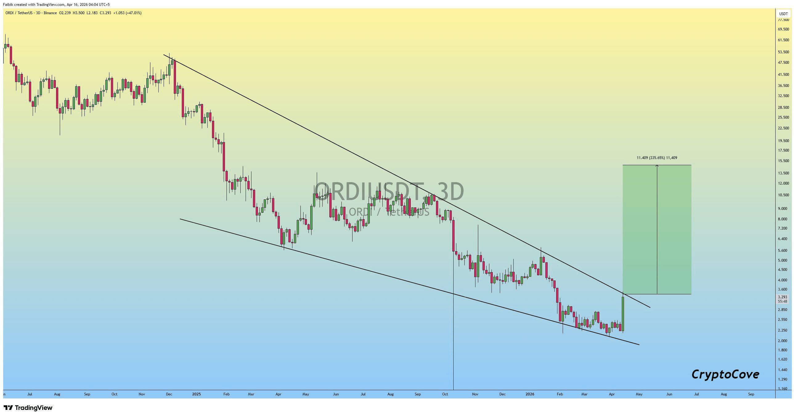 Ordinals đã ghi nhận mức tăng 94% trong một ngày vào ngày 16 tháng 4, trực tiếp chạm vào vùng kháng cự Fibonacci quan trọng đầu tiên. Động thái này diễn ra sau nhiều tháng tích lũy vốn và sự phá vỡ mô hình nêm giảm có thể thấy rõ trên nhiều khung thời gian.