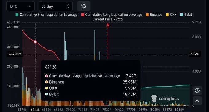 Nếu thị trường thoái lui và rơi về mốc 67.128$ - 67.180$ để lấp đầy khoảng trống CME (CME Gap) còn đang bỏ ngỏ, sẽ có tới HƠN 7,4 TỶ ĐÔ LA ($7.44B) lệnh Long bị thanh lý sạch sẽ!.