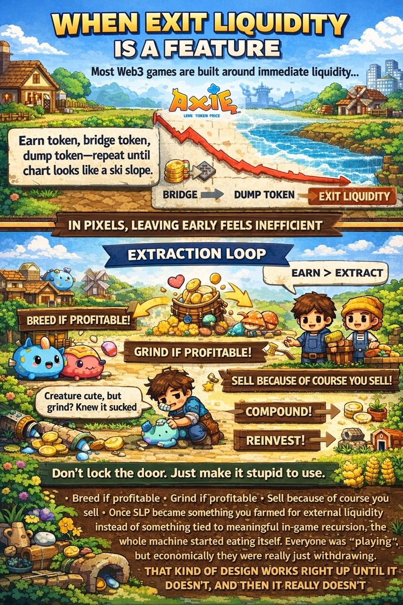 In Axie, the loop eventually got flattened into pure extraction. Breed if profitable. Grind if profitable. Sell because of course you sell. Once SLP became something you farmed for external liquidity instead of something tied to meaningful in-game recursion, the whole machine started eating itself. Everyone was “playing,” but economically they were really just withdrawing. That kind of design works right up until it doesn’t, and then it really doesn’t