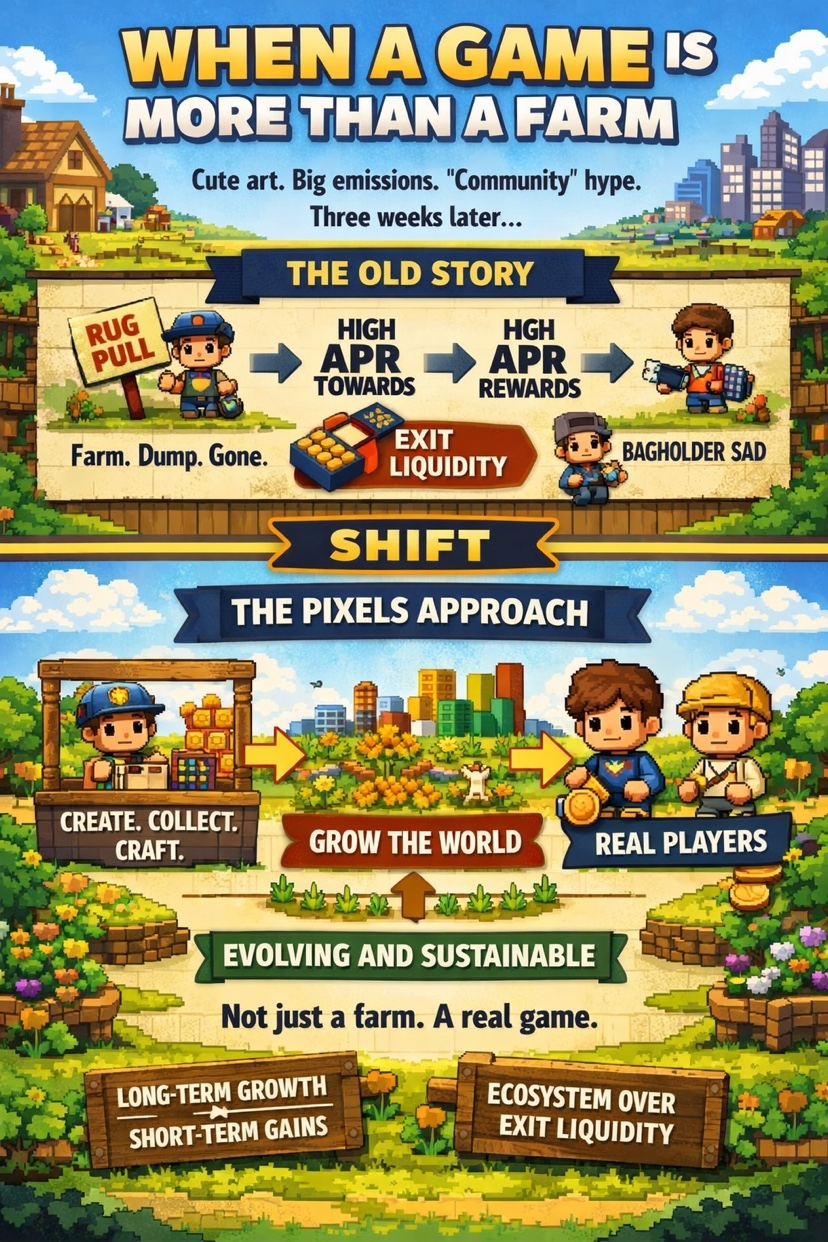 I remember torching almost 2 ETH in 2021 hopping between random farm games because I thought high APR meant demand. It didn’t. It meant I was volunteering to be exit liquidity with extra steps. So when people started talking about Pixels like it was some new revelation, I rolled my eyes a little. Probably another liquidity bug dressed up as gameplay. But here’s the thing: the more I watched it, the less it looked like the usual farm-and-dump loop.