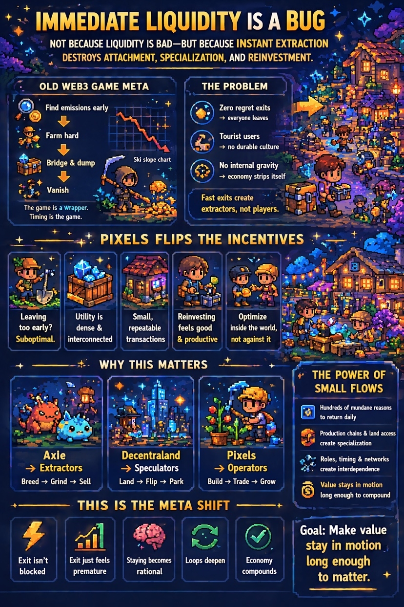 If I can pull value out of a game instantly with no real tradeoff, then the smartest move is usually to become a tourist. Show up, farm, dump, vanish. That creates a culture of temporary users and temporary users do not build durable economies. They strip-mine them. Pixels seems to understand this on a gut level. It keeps utility dense enough that cashing out too aggressively feels suboptimal. Not illegal. Not blocked. Just kind of self-sabotaging.