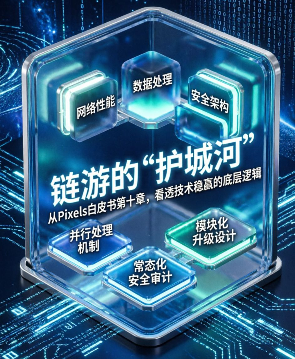 前两天深夜在Pixels里堆叠奖励,本来想顺手领了收益下线,结果网络突然卡了半分钟,连点两次都没反应,我还以为是钱包断连了,等了十来秒才刷新出来。当时我就吐槽,这要是在高峰期,岂不是一忙就崩?直到我静下心来读了白皮书第十章,才明白这点卡顿,其实藏着整个项目最硬核的底层设计,也终于懂了为什么很多老玩家不在乎短期价格,反而天天盯着技术文档更新。#pixel