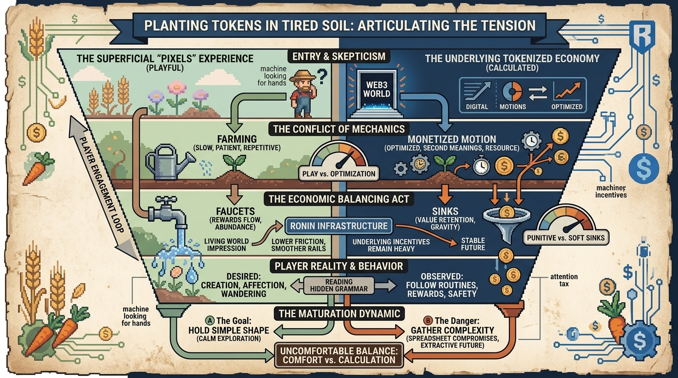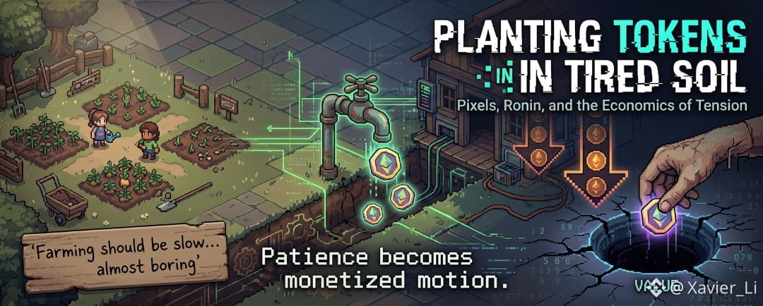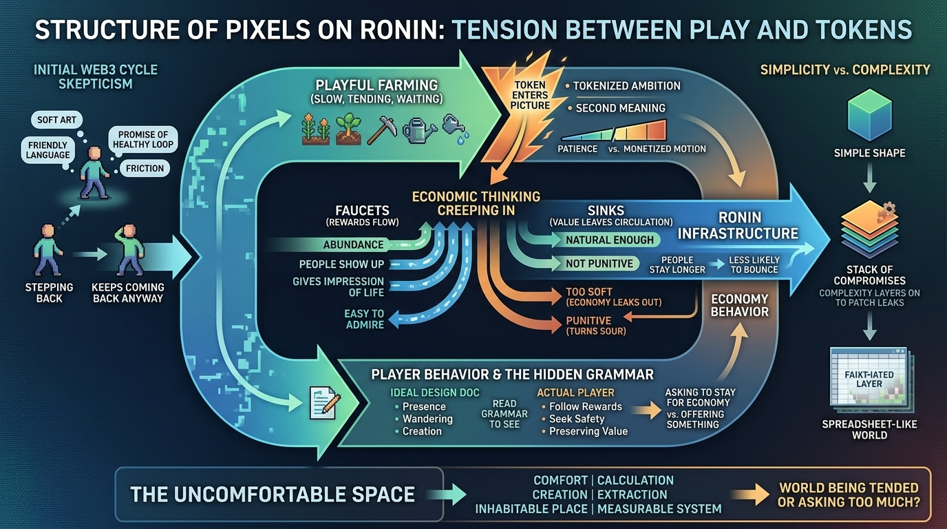 I didn’t take Pixels seriously at first, and honestly, that was mostly self defense. I’ve watched too many Web3 worlds arrive with soft art, friendly language, and a promise that this time the loop will be healthier, the token will behave, the players will stay for reasons that feel almost human. Then the numbers start moving, the incentives tighten, and suddenly the whole thing looks less like a world and more like a machine looking for hands. So when I first looked at Pixels on Ronin, I had that tired little instinct to step back and assume I already knew how the story went.