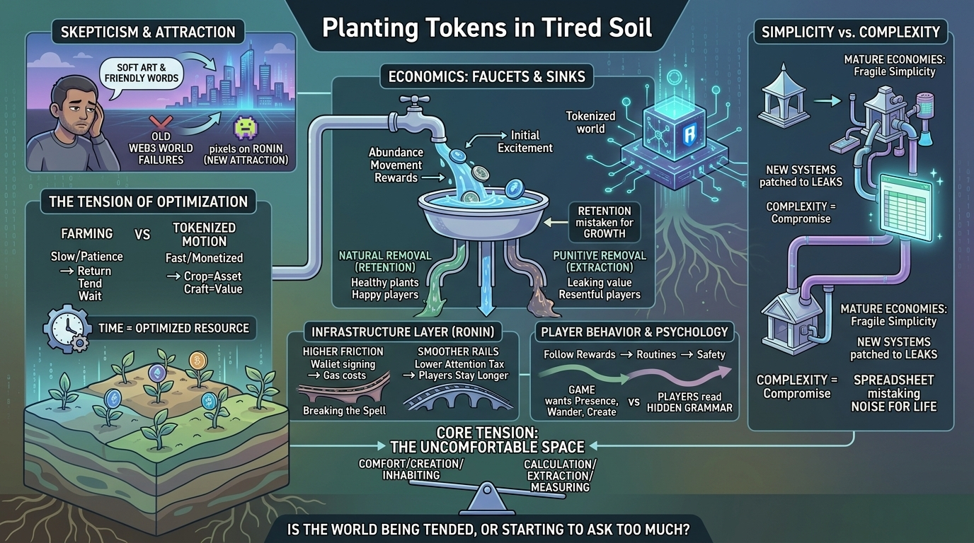 Maybe because farming, of all things, is such a strange vessel for tokenized ambition. Farming should be slow, almost boring in the best way. You return, you tend, you wait, you return again. But once a token enters the picture, patience becomes a kind of monetized motion. Every action starts to carry a second meaning. A crop is no longer just a crop. A craft is never just a craft. The world begins to split into what feels playful and what can be optimized, and those two things do not always sit well together. That tension is the part I notice first, not the feature list, not the branding, just the way the system nudges the player toward seeing time as a resource to be spent efficiently.
