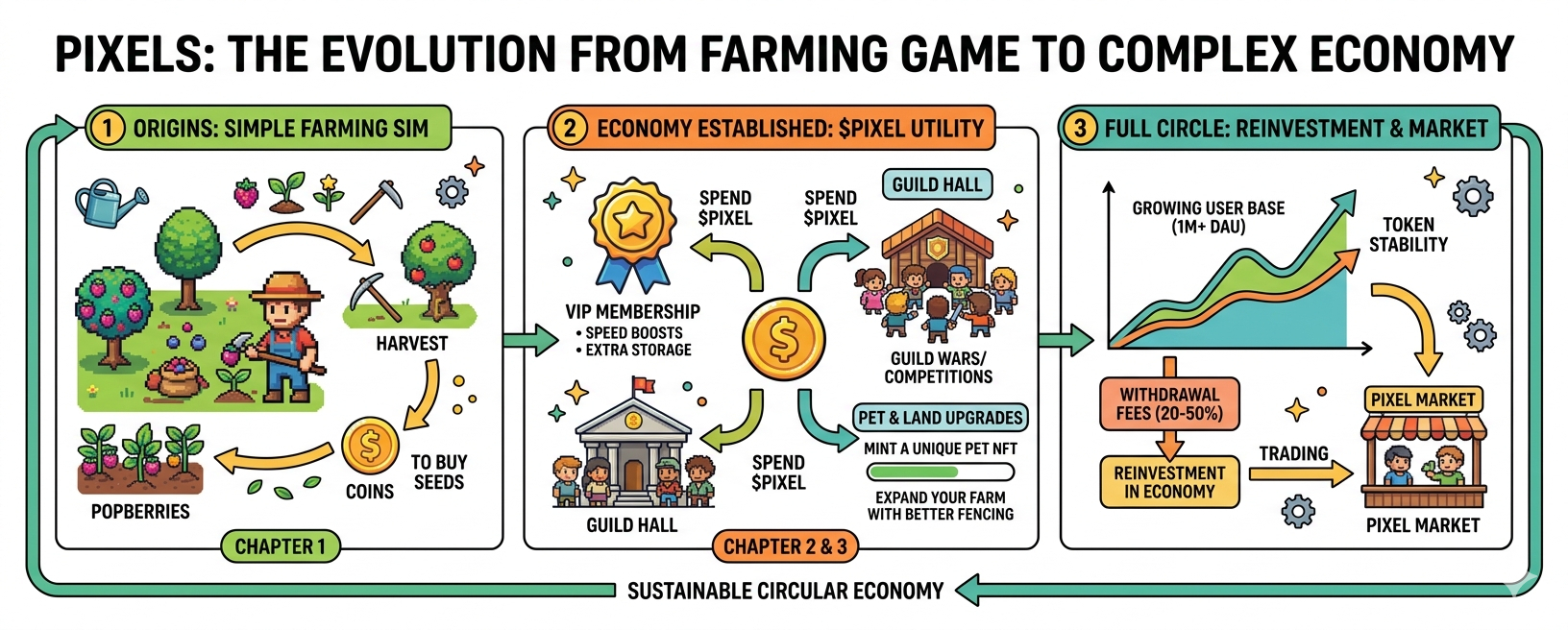 Most blockchain games before it followed a predictable path. They rewarded players heavily at the start, attracted a crowd, and then struggled to keep things stable once those rewards lost value. Pixels seems to have learned from that. Instead of focusing on giving players more, it’s focusing on making players matter to each other. What you grow isn’t just for you—it feeds into crafting, trading, and upgrades that other players rely on too. Over time, you stop thinking of it as “my progress” and start seeing it as part of a shared system.