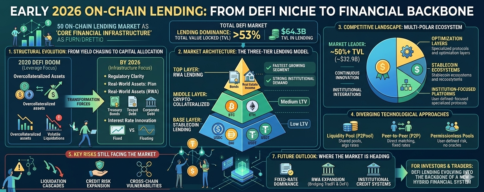 The on-chain lending sector has decisively transitioned from a speculative DeFi niche into one of the most critical pillars of the digital financial system. By early 2026, lending protocols command over $64.3 billion in total value locked (TVL)—more than 53% of the entire DeFi ecosystem—highlighting their dominance and maturity.