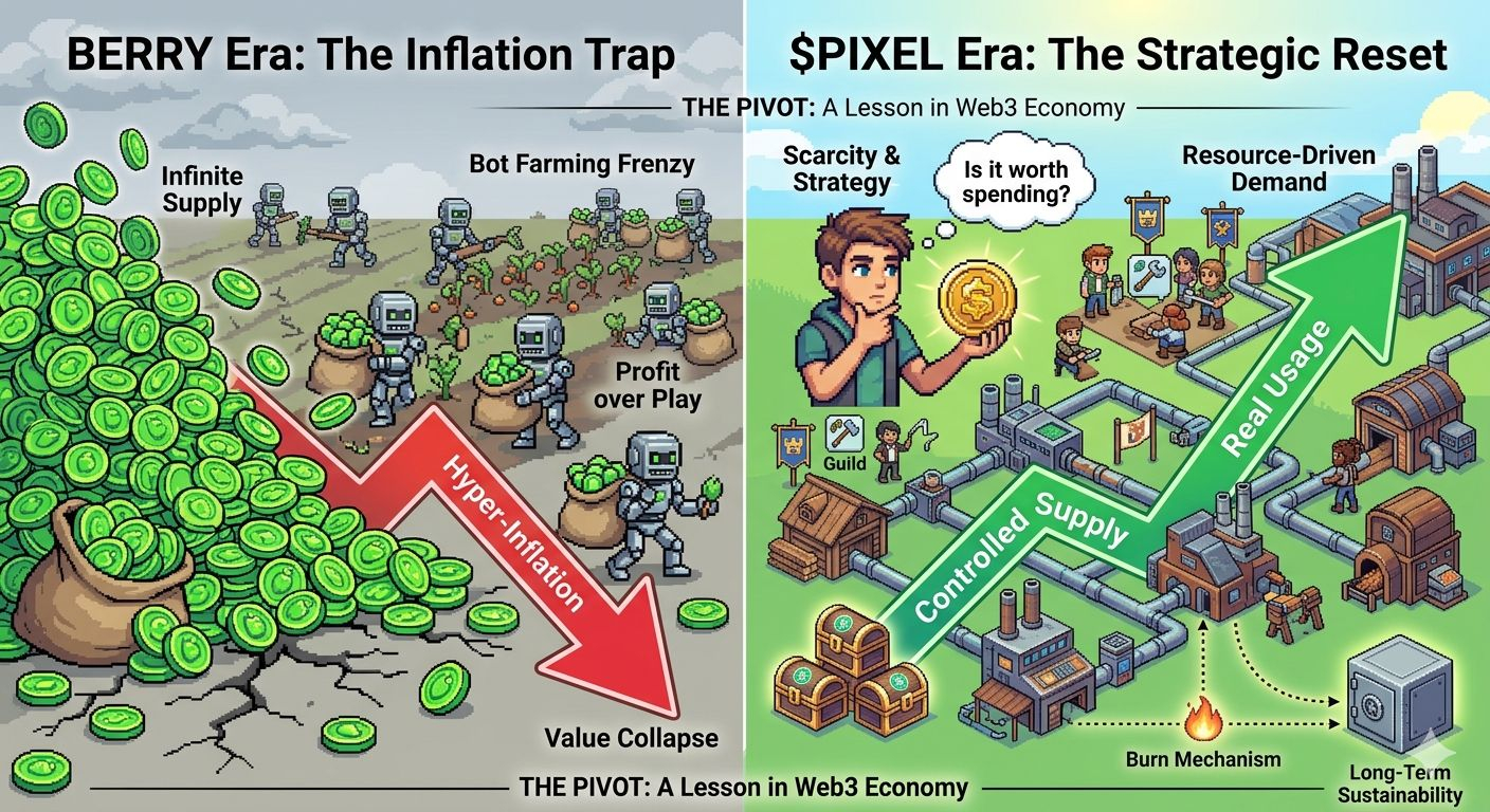 The shift of Pixels from BERRY to $PIXEL wasn’t just a simple game update—it felt more like a major lesson in blockchain gaming. When you look back at it, you realize how difficult it is to save an economy that’s heading toward collapse. In many ways, it was a battle between easy, short-term growth and long-term sustainability. At the beginning, BERRY was designed to be simple: you farm, you earn, and you spend. But the real problem started when it became on-chain and easily tradable. Once players could convert in-game currency into real value, the focus shifted. People stopped playing for enjoyment and started playing for profit. That’s when bots and heavy grinders took over, flooding the system with supply. Over time, inflation got out of control, and BERRY lost its value completely. When players have more currency than they can realistically spend, it stops feeling rewarding. It turns into just a number, and the motivation to play fades away.