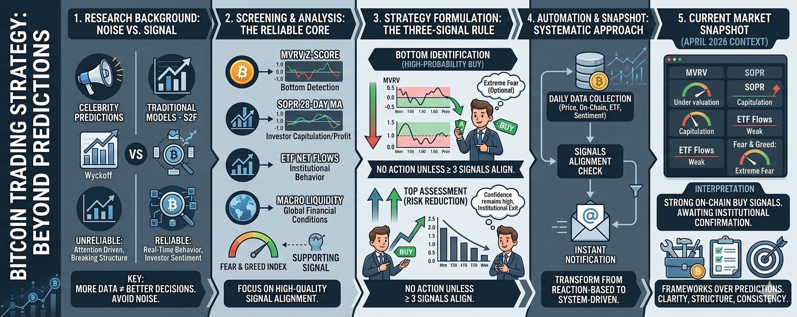 By focusing on just four key dimensions—on-chain behavior, institutional flows, macro conditions, and sentiment—you can build a system that adapts to changing market structures rather than breaking under them.