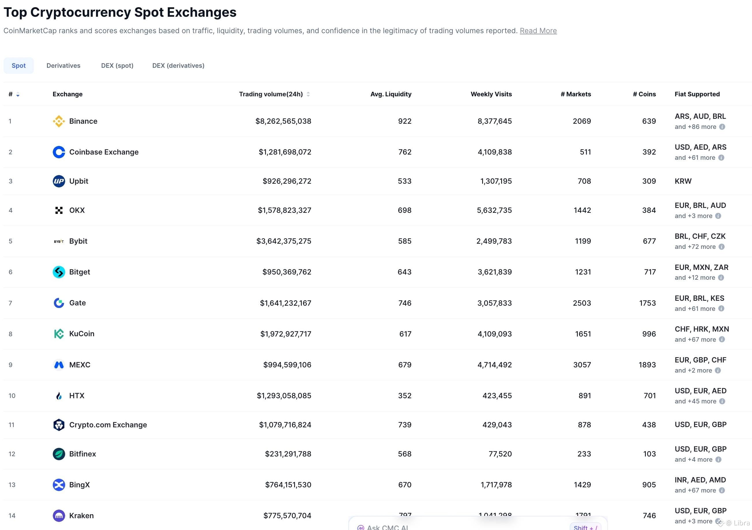 Xếp hạng các sàn crypto lớn trên thế giới theo khối lượng giao dịch. Nguồn: CoinGecko (20/04/2026)