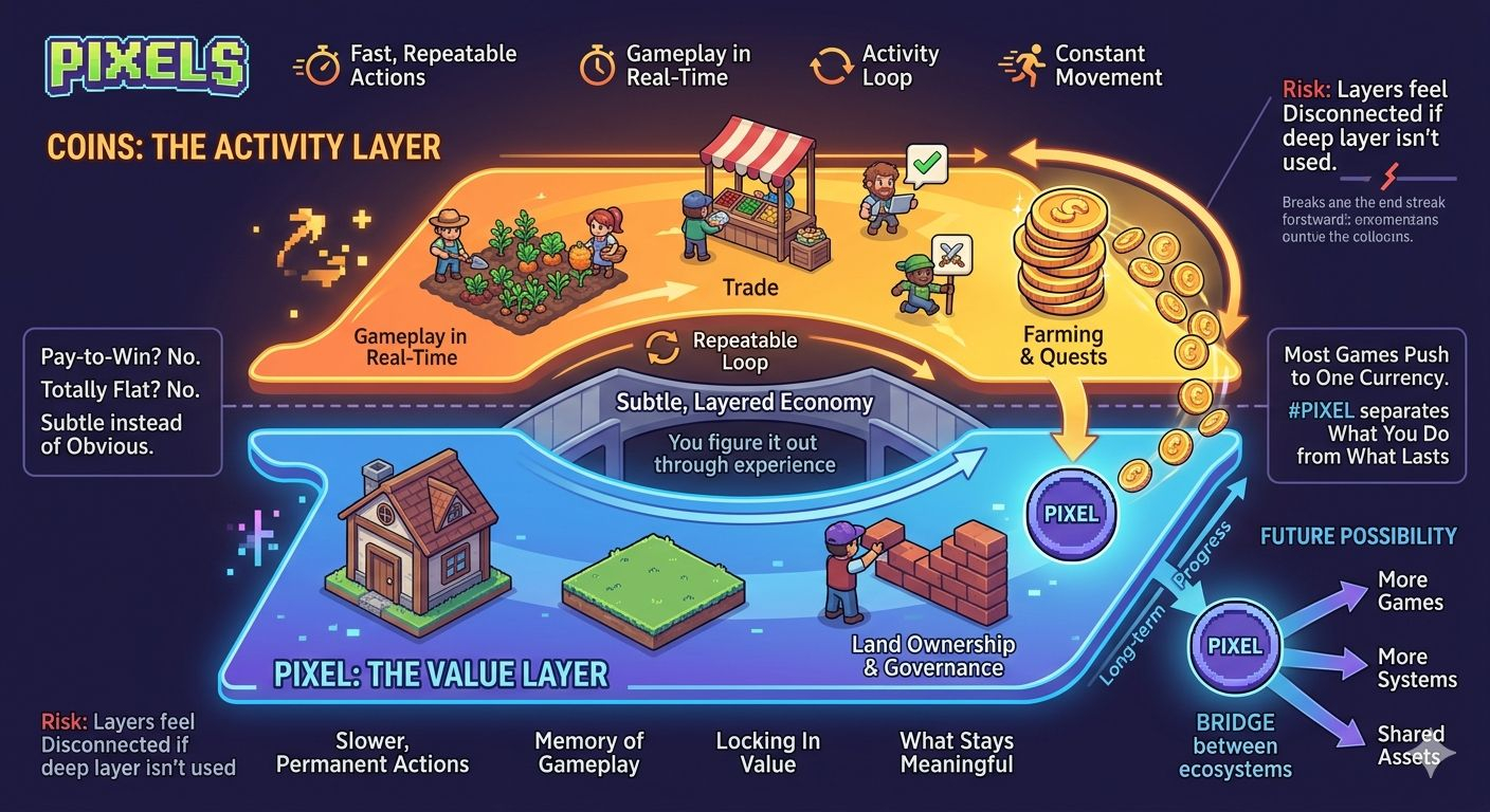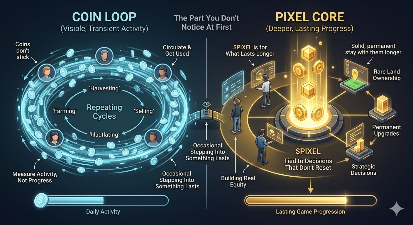 If most players stay in the Coin layer (which is likely), then a big part of the economy is constantly active but not deeply connected to PIXEL.