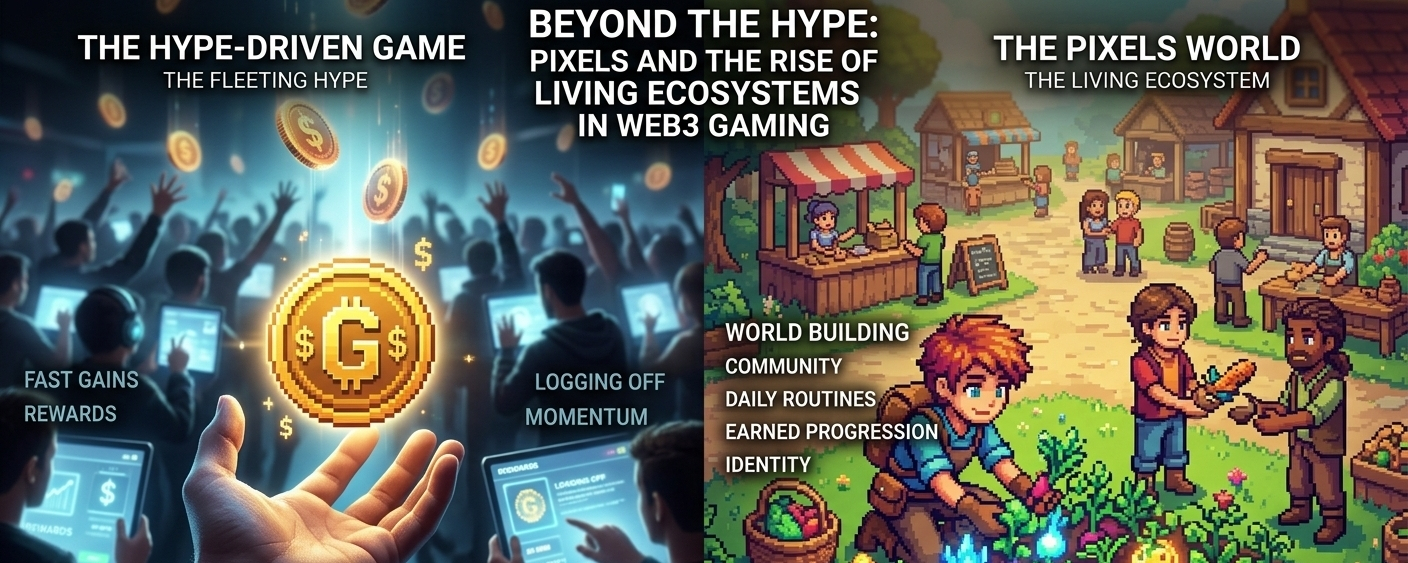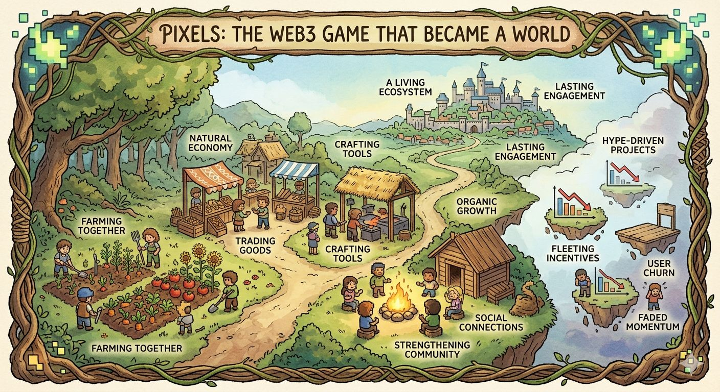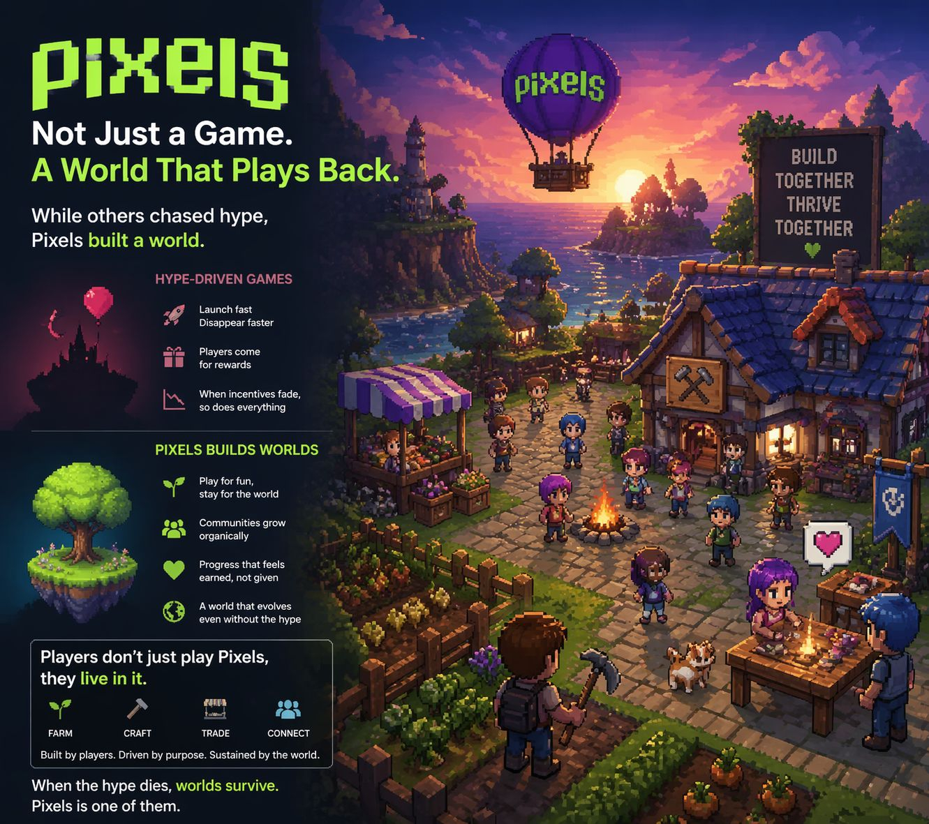 Players act less like investors chasing gains and more like citizens contributing to a living space. That’s a foundation momentum driven projects rarely achieve. As Web3 gaming evolves, a simple truth emerges attracting users is easy retaining them requires design that feels alive even without hype. Pixels demonstrates that real growth starts when players stop asking what they can extract and start asking what they can build. The future of blockchain gaming may not belong to the loudest launch or fastest trend but to worlds that continue to thrive even when no one is watching. @Pixels shows the difference between playing a game and living in a world.