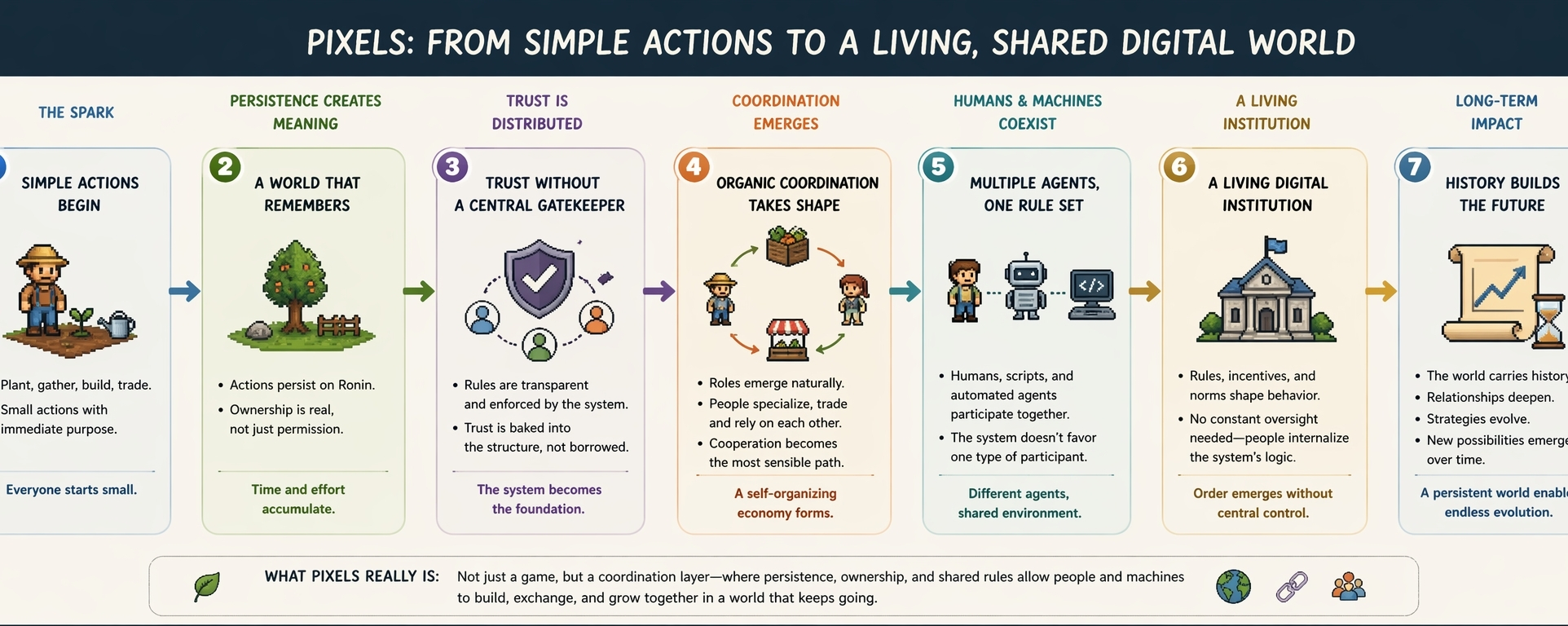 In that sense, Pixels feels like a subtle shift in how digital worlds are constructed. It moves away from the idea of isolated experiences and toward something more persistent and interconnected. The blockchain element plays a role in that persistence, but what matters more is how it shapes behavior. It creates a setting where actions have weight, where participation leaves traces that others can build upon.
