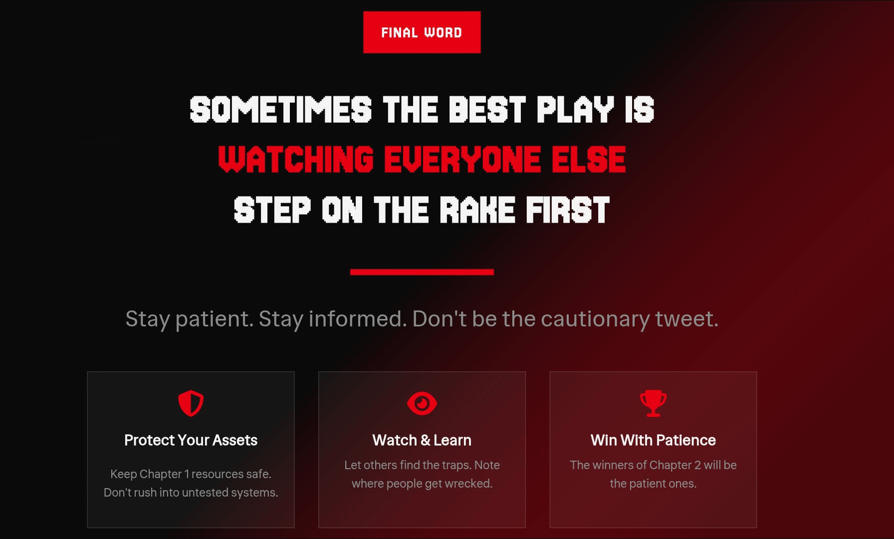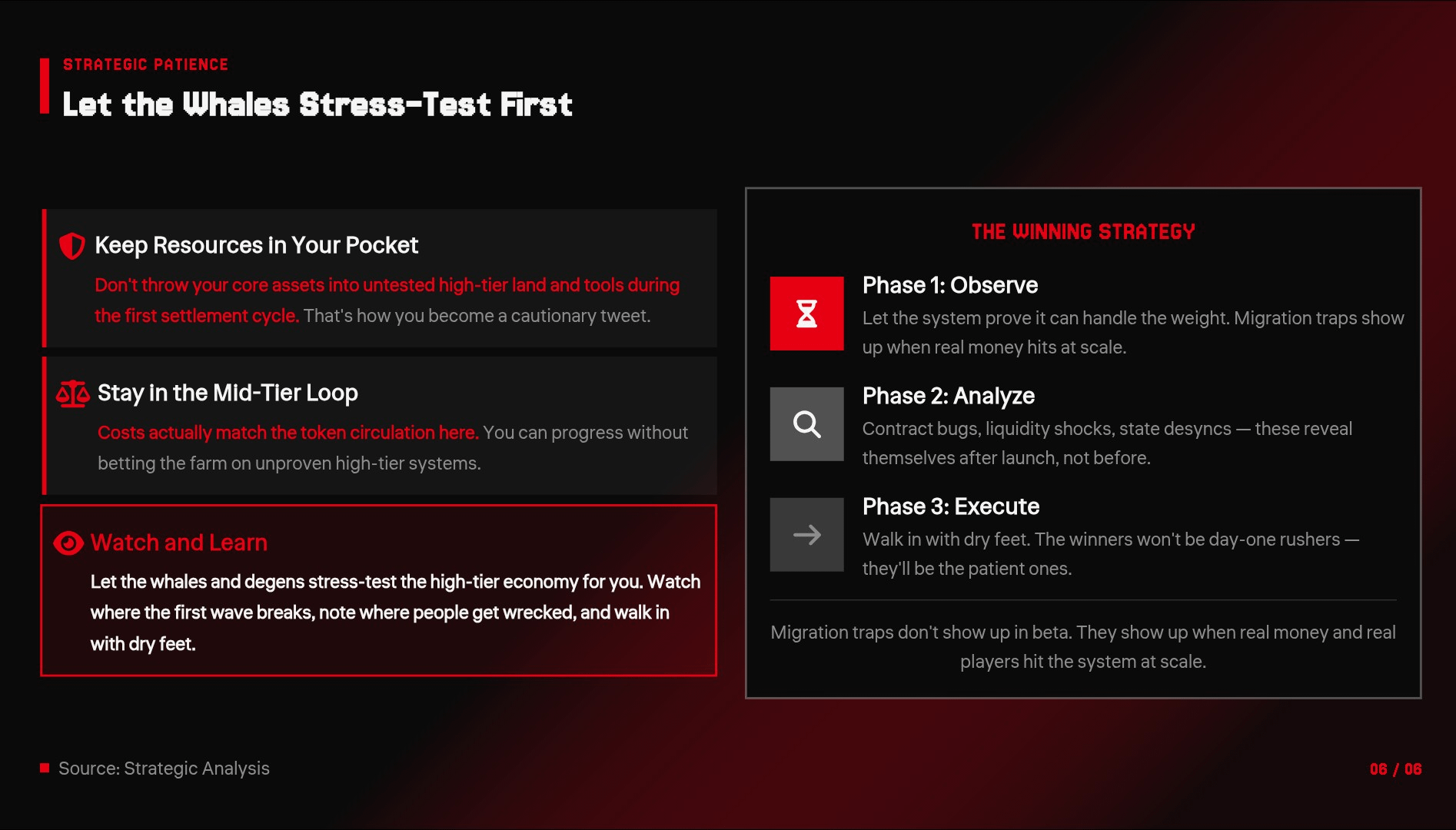 Saran jujurku? Simpan sumber daya Chapter 1-mu di saku. Tetap di lingkaran menengah di mana biaya benar-benar sesuai dengan sirkulasi token. Biarkan para ikan paus dan degens melakukan stress-test ekonomi tier tinggi untukmu. Perhatikan di mana gelombang pertama pecah, catat di mana orang-orang hancur, dan masuklah dengan kaki kering.