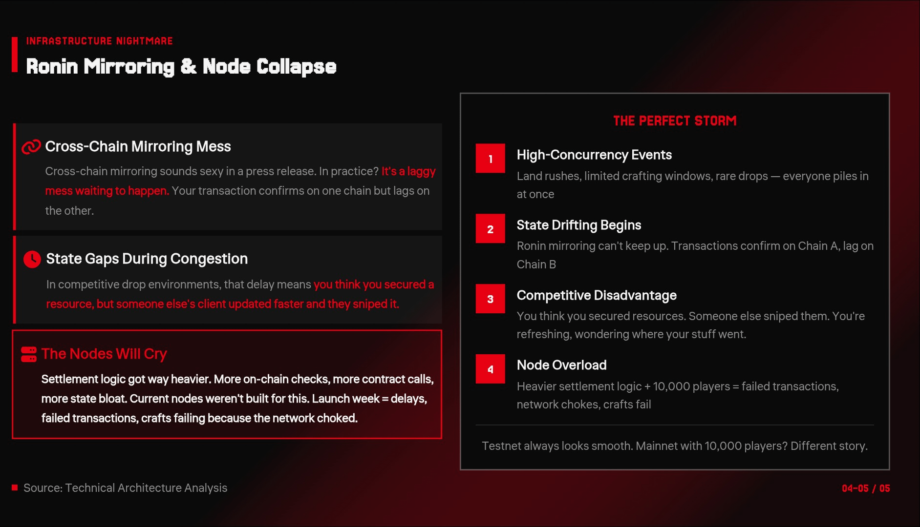 Ketika kamu memiliki acara dengan banyak koneksi — rush tanah, jendela crafting terbatas, drop langka — status cermin di Ronin mulai melayang. Transaksimu mungkin terkonfirmasi di satu rantai tetapi tertinggal di rantai lainnya. Dalam lingkungan drop yang kompetitif, keterlambatan itu berarti kamu berpikir telah mengamankan sumber daya, tetapi klien orang lain diperbarui lebih cepat dan mereka menyambar itu. Sementara itu, kamu duduk di sana menyegarkan, bertanya-tanya ke mana barangmu pergi.
