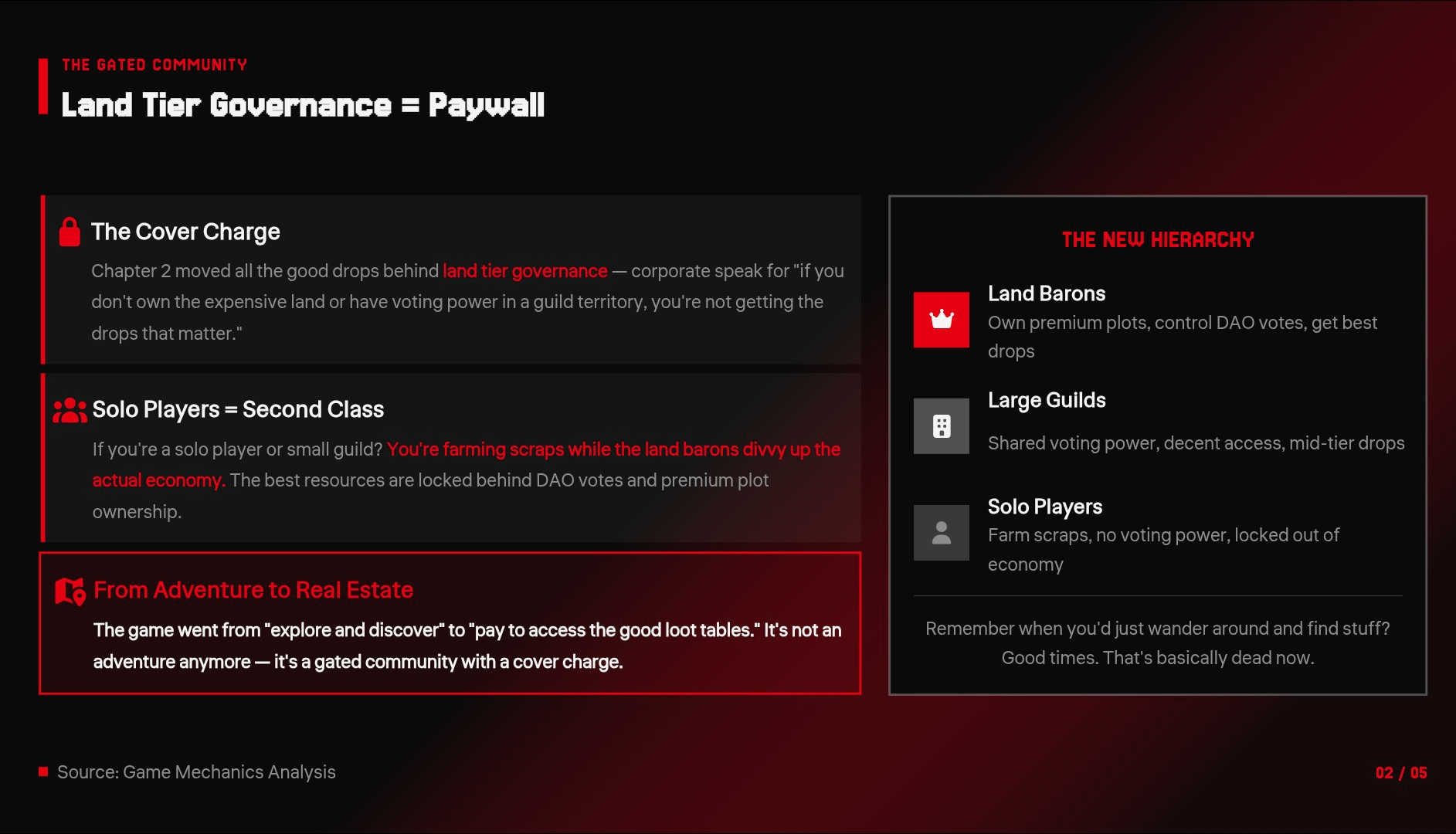 Chapter 2 memindahkan semua drop bagus di belakang pemerintahan tier tanah, yang hanyalah istilah korporat untuk "jika kamu tidak memiliki tanah mahal atau memiliki kekuatan voting di wilayah guild, kamu tidak akan mendapatkan drop yang penting." Permainan ini berubah dari "menjelajah dan menemukan" menjadi "bayar untuk mengakses tabel loot yang baik." Ini bukan petualangan lagi — ini komunitas berpagar dengan biaya masuk. Sumber daya terbaik terkunci di balik suara DAO dan kepemilikan plot premium. Jika kamu pemain solo atau guild kecil? Ya, kamu hanya bertani sisa-sisa sementara para baron tanah membagi ekonomi yang sebenarnya.$币安人生