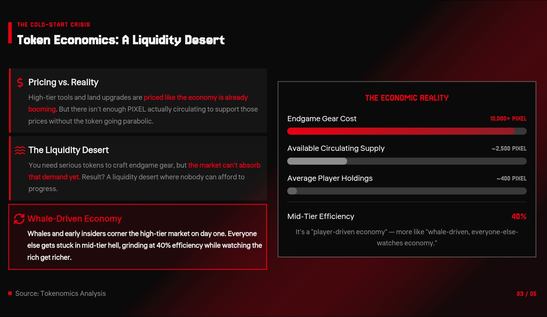 Yang ini favoritku. Alat tier tinggi dan peningkatan tanah dipatok seperti ekonomi sudah booming. Tapi inilah kenyataannya: tidak ada cukup PIXEL yang sebenarnya beredar untuk mendukung harga-harga itu tanpa token benar-benar parabolik — atau lebih mungkin, menciptakan gurun likuiditas di mana tidak ada yang bisa maju.