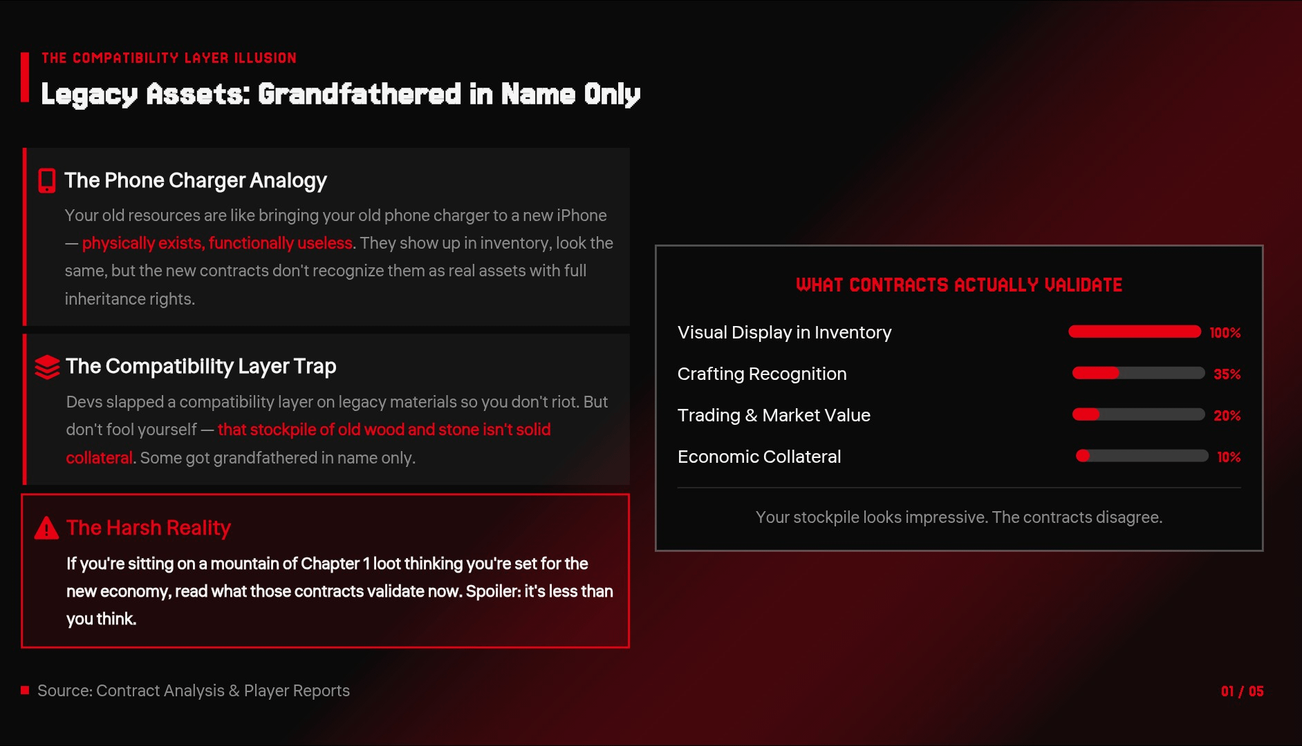 Ini yang orang-orang tidak katakan secara langsung: sumber daya Chapter 1 kamu tidak berfungsi dengan cara yang sama lagi. Tentu, mereka muncul di inventaris kamu. Mereka terlihat sama. Tapi di balik layar? Kontrak baru tidak mengenali mereka sebagai aset "nyata" dengan hak waris penuh. Ini seperti membawa charger ponsel lama ke iPhone baru — secara fisik ada, secara fungsional tidak berguna.