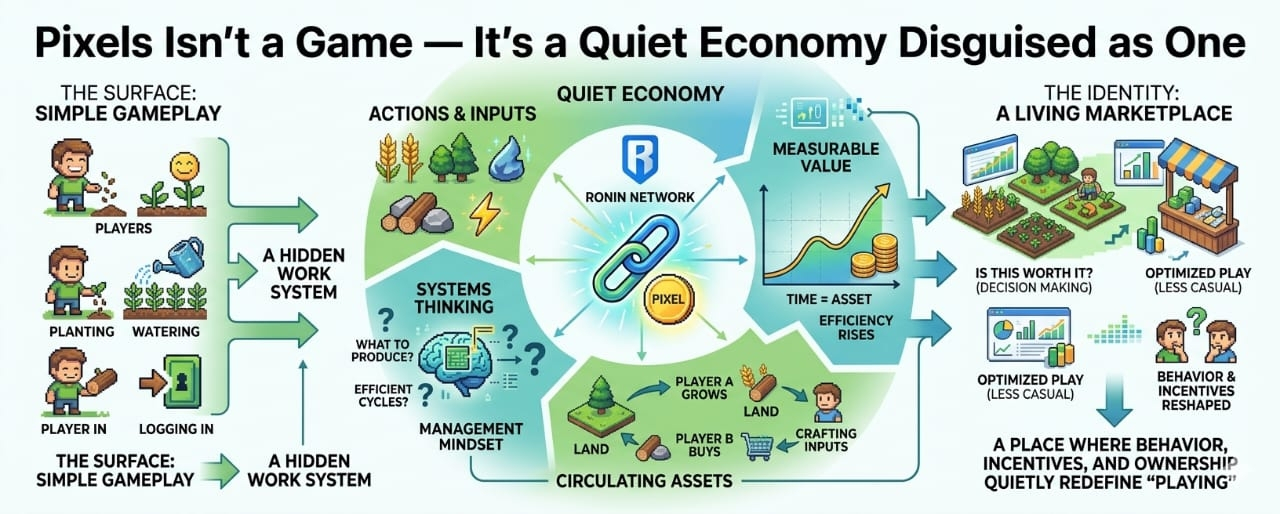 Pixels shows that the moment a game starts valuing your time in measurable terms, it stops being just a place to play and becomes a place where behavior, incentives, and ownership quietly reshape what “playing” even means.