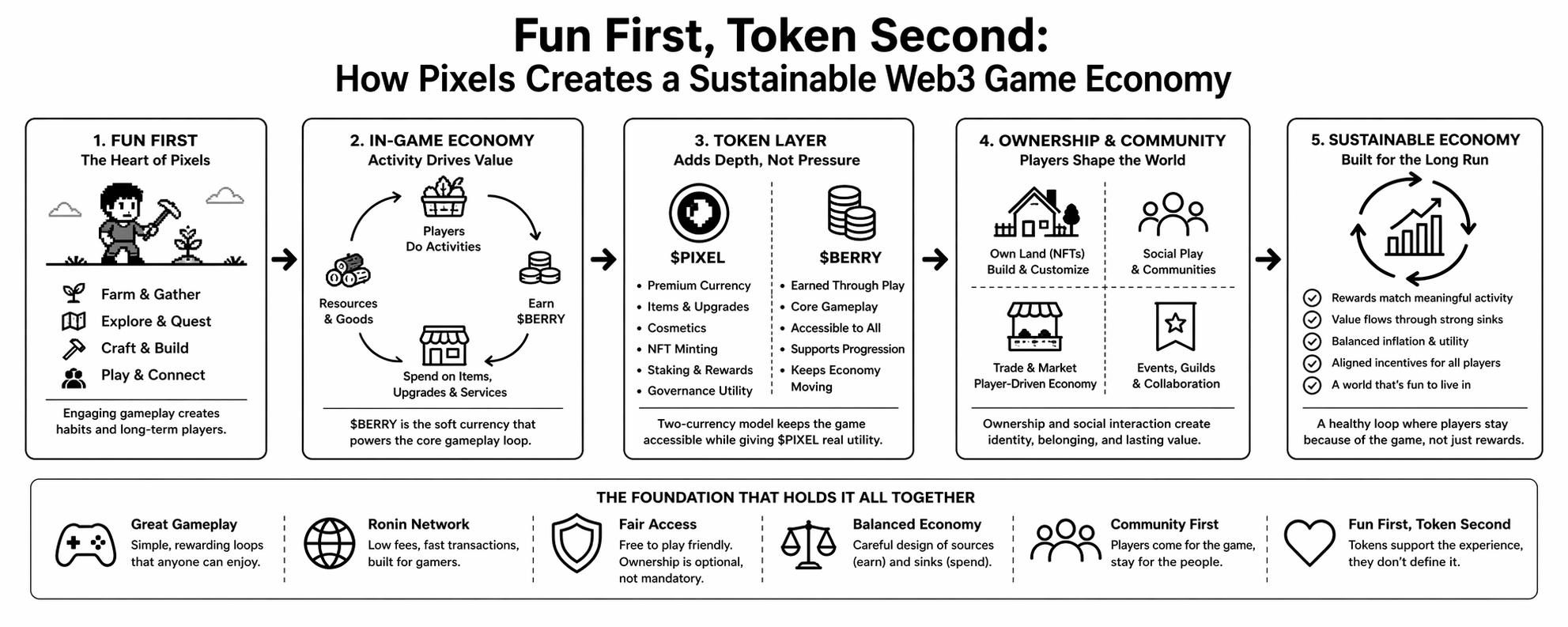 Pixels has many of the right ingredients: a simple core loop, social design, land ownership, layered currencies, Ronin infrastructure, and a token with ecosystem utility.