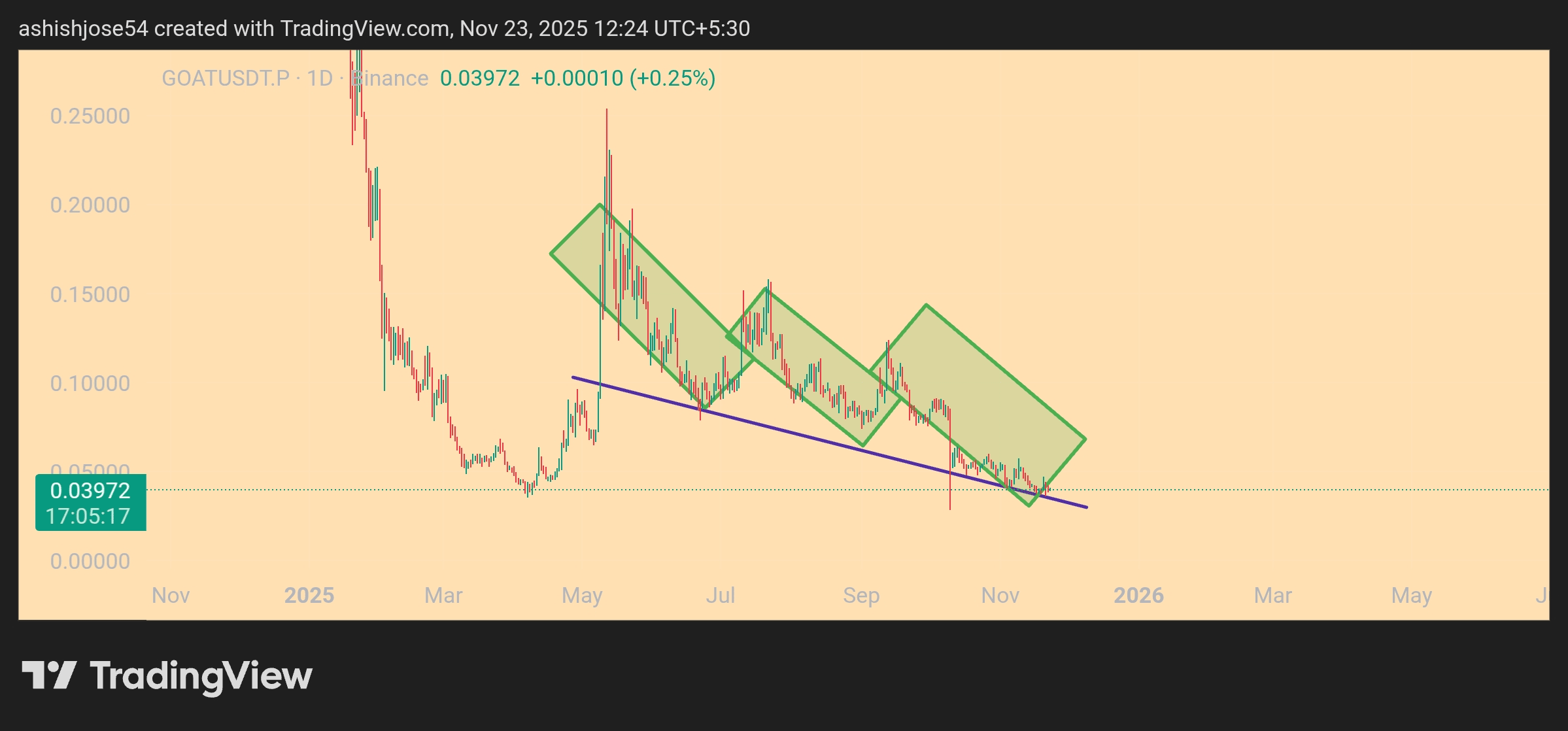 Grafik harian GOAT/USDT menunjukkan tren turun yang persisten, ditandai dengan serangkaian saluran paralel menurun yang dimulai pada Mei 2025. Harga secara konsisten menghormati saluran turun ini, dengan setiap fase konsolidasi ditandai oleh pemulihan sementara di dalam kotak hijau, tetapi momentum keseluruhan tetap bearish