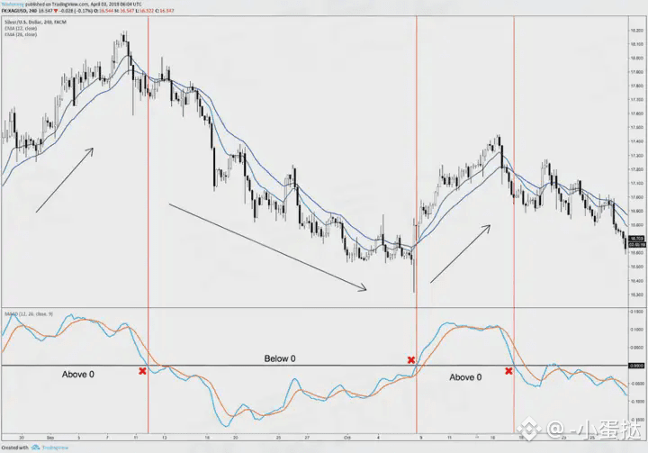当价格图上的两条EMA发生交叉时,MACD线也会向下穿越零轴——我们用 x 和一条竖线标记了交叉点。