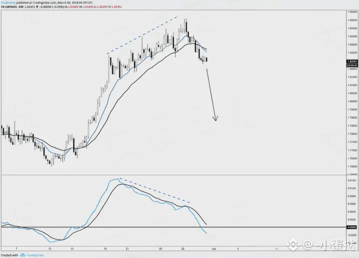 随后动量发生变化,价格仅缓慢上升,涨幅有限。MACD开始下行,这表明动量正在发生变化。