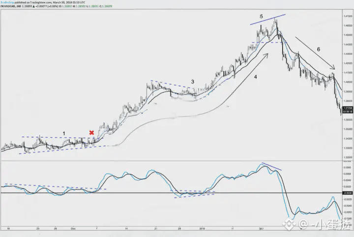 在顶部 (5),价格创出更高的高点,而MACD却创出更低的高点。这是典型的背离信号。背离表明趋势动能减弱,是一种强烈的反转模式。