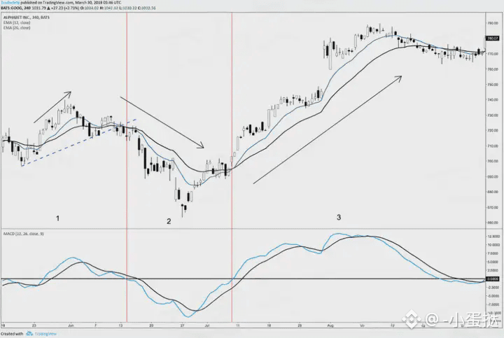 在点 3,价格进入横向盘整期。MACD在盘整过程中回撤至零轴。随后,MACD线和价格的突破引发了下一阶段的趋势。