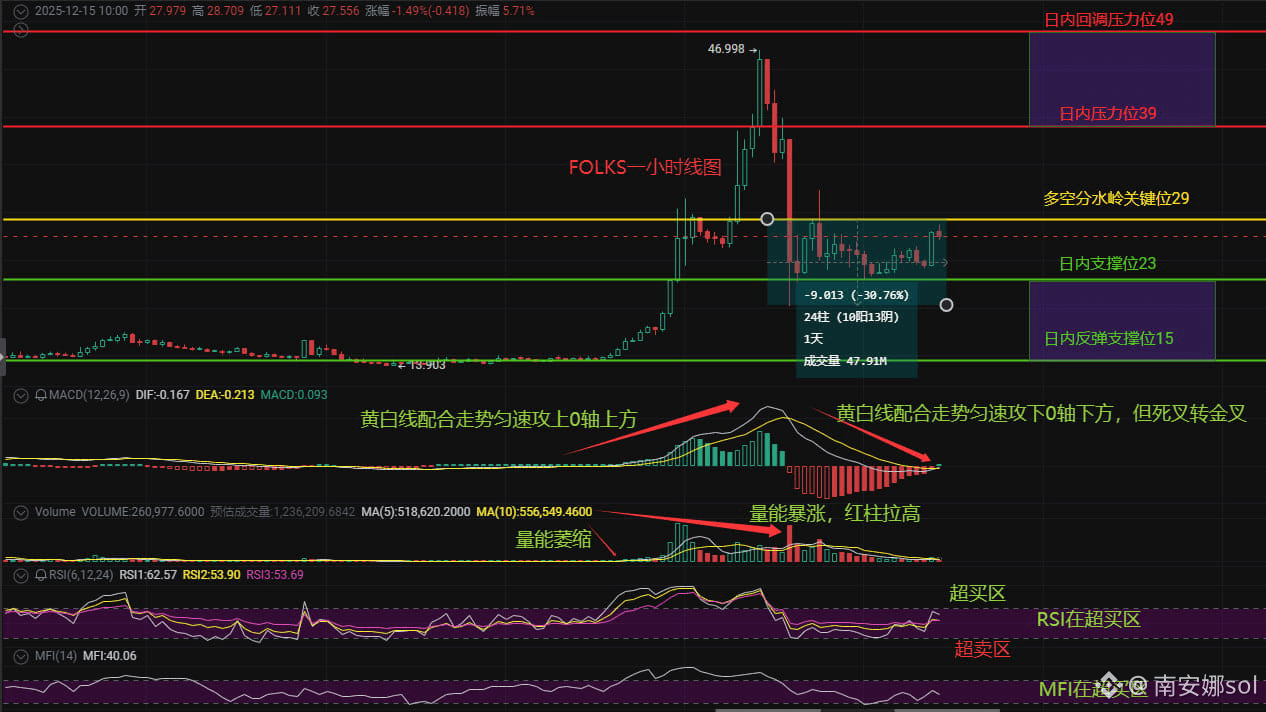 所以,我的判断很明确:今天乃至接下来一两天,FOLKS的主旋律就是围绕29这个“多空分水岭”反复争夺。 上方39和49是两层厚重的天花板,没大利好根本摸不到;下方的防线在23,这里是短期生命线,万一破了,下一个驿站就得看15附近了。