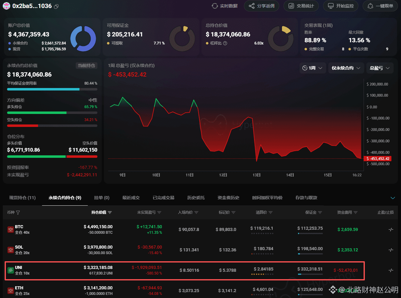 币友们,我是赵公明!$UNI 盘面上正躺着一具“巨鲸尸体”,它可能会拖垮整个市场。最新数据显示,某巨鲸在11月销毁提案利好当日追多UNI,如今浮亏已达惊人的580%,亏损193万美元,成为平台上的最大多头“炮灰”。关注赵公明,三分钟为你拆解,为何深套的巨鲸将成为UNI反弹路上最大的“堰塞湖”。