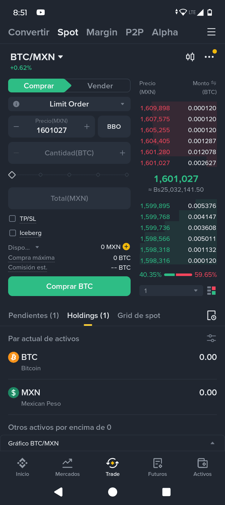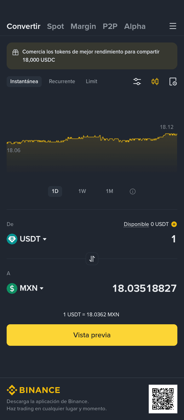 Dalam gambar berikut kita dapat melihat mata uang fiat (Peso Meksiko) dalam alat Binance Convert, di mana kita dapat mengonversi sebuah #USDT directly ke Peso Meksiko. Dalam gambar kedua, kita melihat antarmuka untuk Trading Spot di Binance dengan Pasangan MXN/BTC, perlu dicatat bahwa tidak semua mata uang fiat tersedia di kedua alat.
