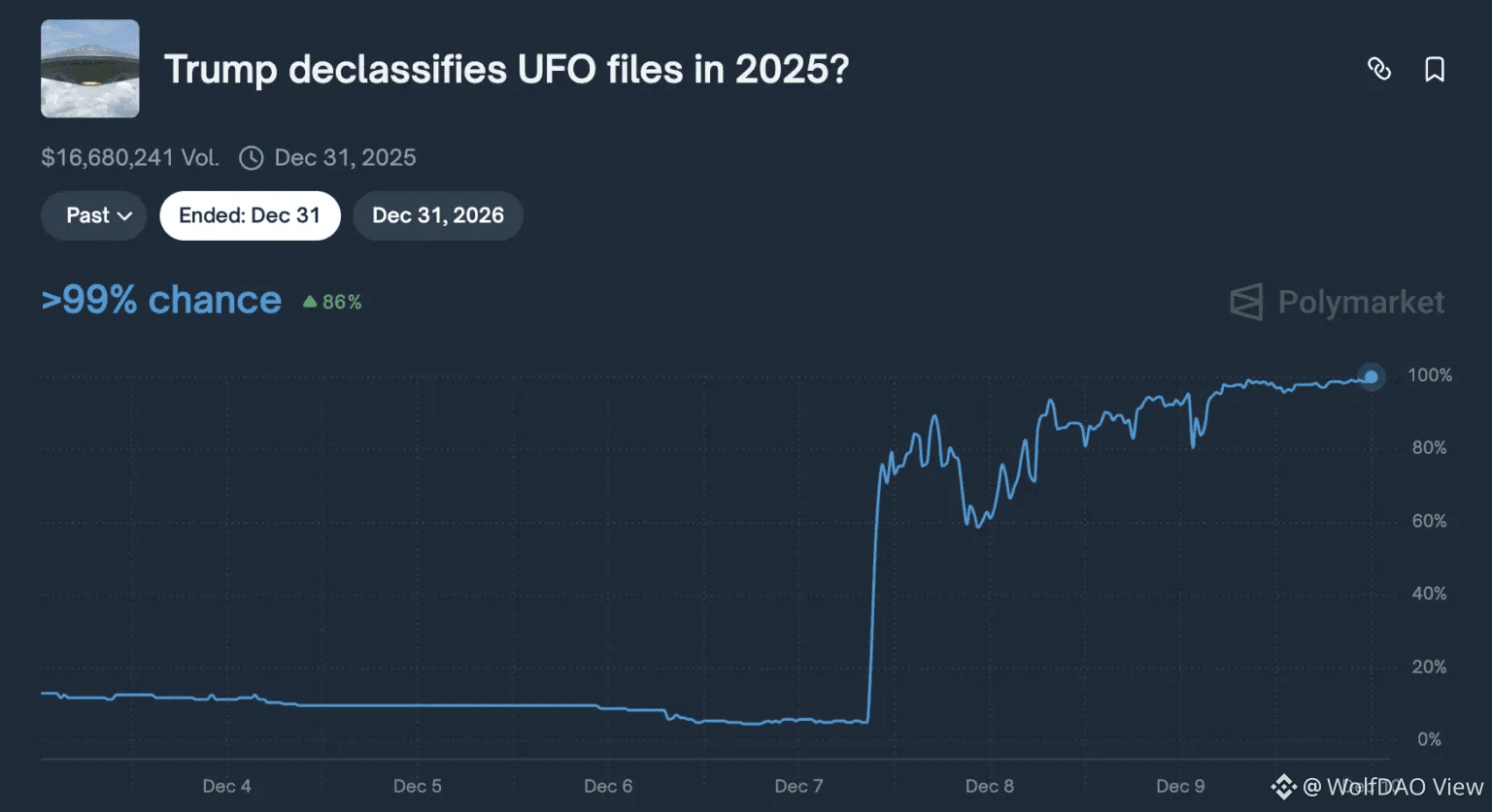 理论上的风险已经在2025年转化为血淋淋的现实。UFO文件解密市场的崩盘就是一个典型案例。这个市场于2025年4月创建,询问特朗普政府是否会在2025年解密UFO文件,交易量达到1600万美元,吸引了大量投机者。操纵过程分为几个精心设计的步骤:鲸鱼首先在结算前以接近面值的价格买入"YES"股份,然后利用Polymarket依赖的UMA预言机系统发起攻击。