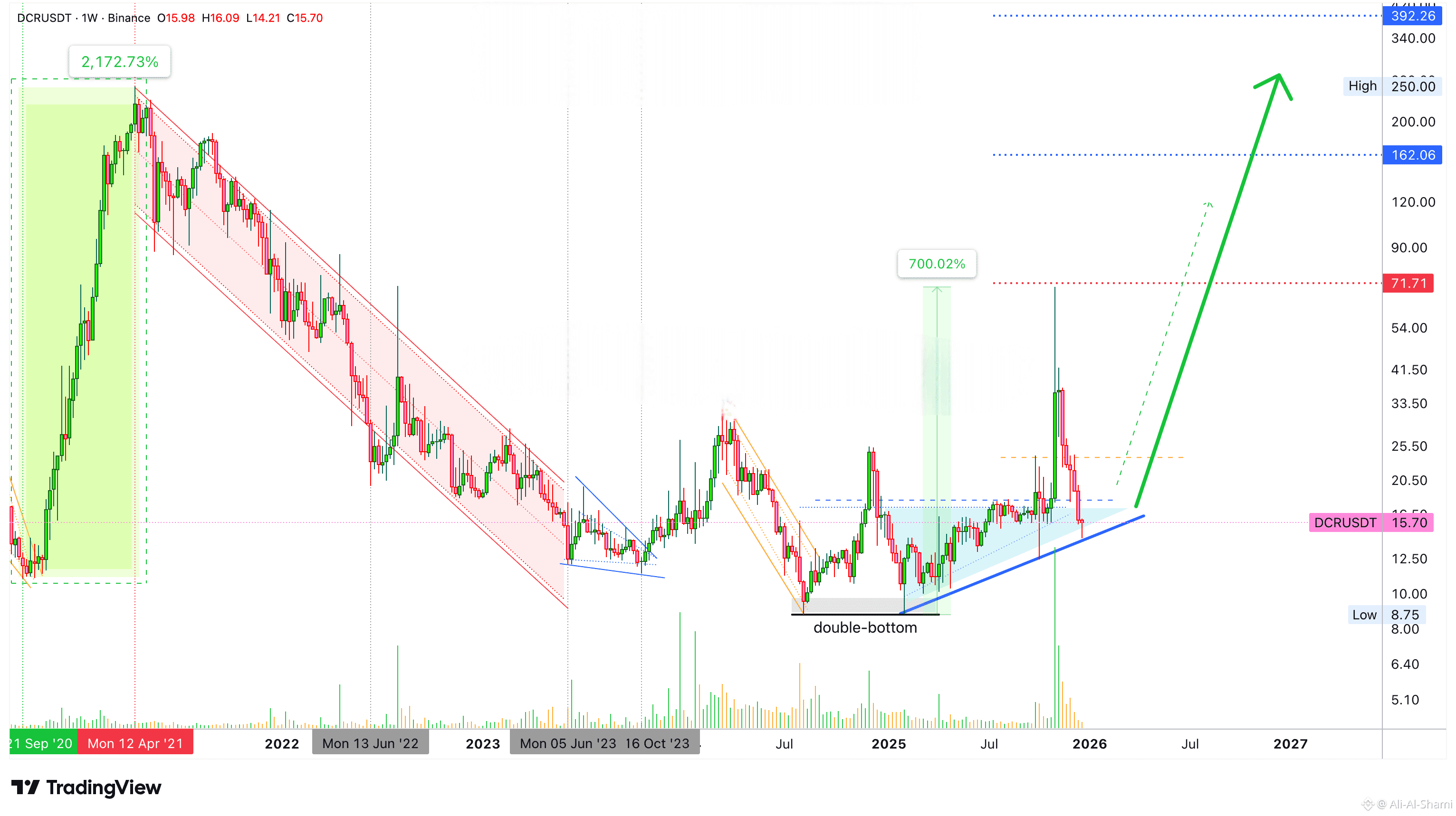 وصلت Decred إلى أدنى مستوى كبير في أغسطس 2024. تم مطابقة هذا الانخفاض مع انخفاض آخر في فبراير 2025، مما أعطانا قاع مزدوج. إشارة رأيناها بشكل متكرر. من هذا النمط حدث التوحيد كشكل مثلث صاعد وكان هناك قفزة صعودية نهائية في أوائل نوفمبر. بلغ إجمالي النمو 700% ومدة ذلك كانت 273 يوماً. لاحظ أنه استغرق أكثر من 7 أشهر من التوحيد قبل التقدم النهائي. إذا كنت ستقسم مدة الحركة الكاملة مع الحجم الكامل للموجة، يمكنك الحصول على عائد شهري متوسط على هذه الصفقة. كان لدينا دخول قبل القفزة النهائية مباشرة في أوائل نوفمبر.