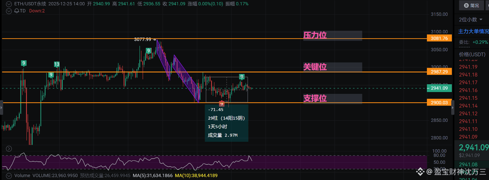 持有ETH的玩家注意!若价格跌至2900附近,分批加仓!设置止损位2880,若触发则暂时离场。若价格反弹突破2987,则加仓追击,目标3050!空仓者更需谨慎——现在不是追涨时机,而是等待“黄金坑”的信号!记住:主力永远在散户恐慌时吸筹,在贪婪时派发!
