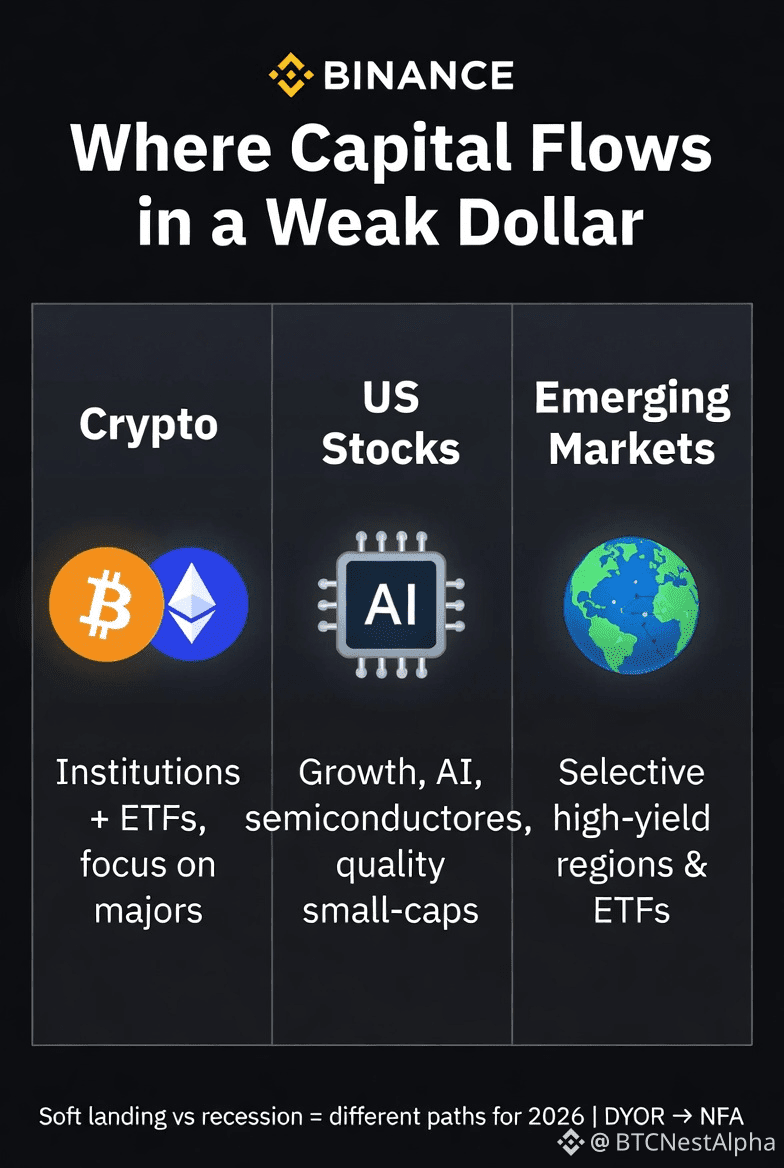 Three Rules in Weak Dollar PhasesCapital leaves USD assets: Weaker dollar environments often push money toward higher‑return opportunities such as US stocks, crypto, and select emerging markets with strong carry and growth stories.