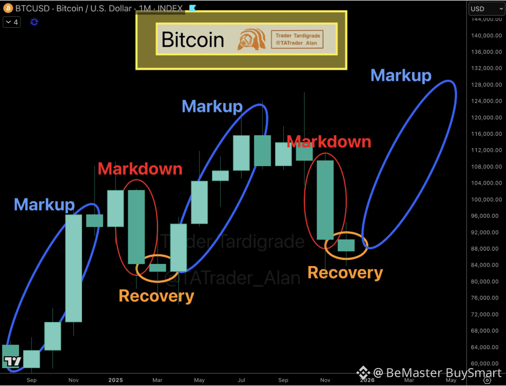 ✨ The monthly chart marks strong upward runs as "Markup" and downward stretches as "Markdown." After each markdown, there's a "Recovery" label showing the early bounce before the next markup wave begins. The price scale runs from roughly $60,000 up to $140,000, giving a wide-angle view instead of focusing on daily swings. The most recent section shows a sharp markdown candle followed by a smaller recovery candle, which is circled and linked to a projected markup path highlighted in blue.