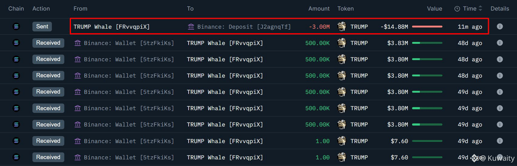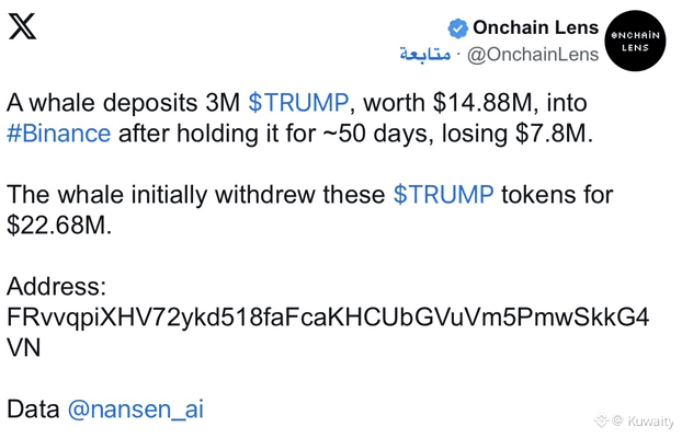 • قام أحد كبار المستثمرين بتحويل 3 ملايين رمز TRUMP إلى منصة Binance اليوم.