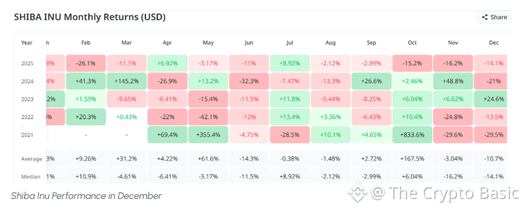 Historically, December has proven unfavorable for SHIB, with the asset frequently closing the month in negative territory.