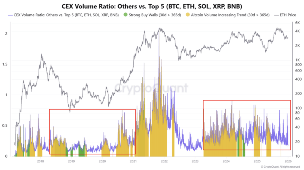 Salah satu sinyal yang paling membingungkan berasal dari volume perdagangan. Laporan menunjukkan bahwa volume perdagangan di bursa terpusat aset alternatif (di luar 5 aset terbaik) saat ini lebih tinggi dibandingkan siklus sebelumnya. Secara permukaan tampak positif, namun harga tidak naik.
