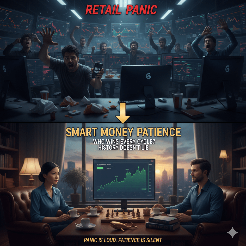 Investor institusional, paus, dan trader cerdas? Mereka melihat kekacauan sebagai kesempatan. Kesabaran adalah senjata mereka. Mereka membeli ketika orang lain menjual, menahan ketika orang lain keluar, dan membiarkan penggandaan bekerja sihirnya.