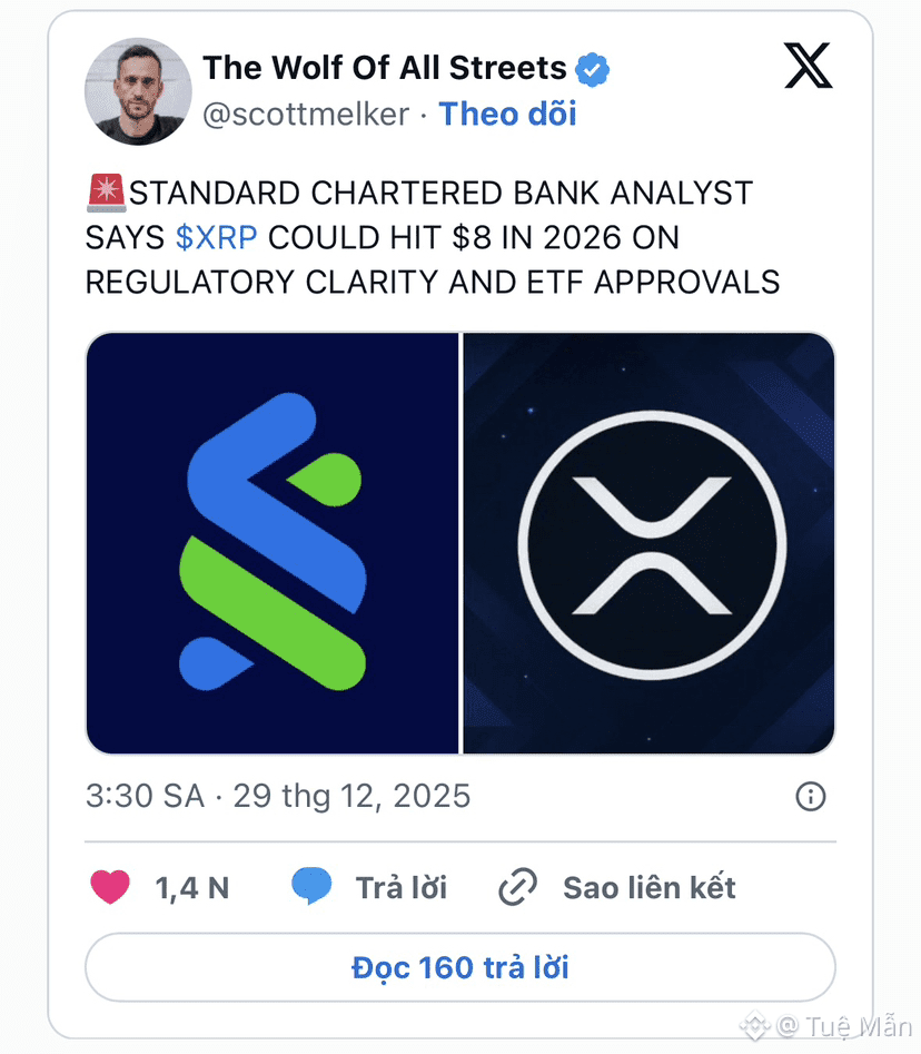Ngân hàng Standard Chartered cũng đồng tình với quan điểm này, dự báo XRP có thể đạt mốc $8 vào năm 2026 nhờ sự tham gia gia tăng của các tổ chức và chiến lược phân bổ vốn dài hạn.