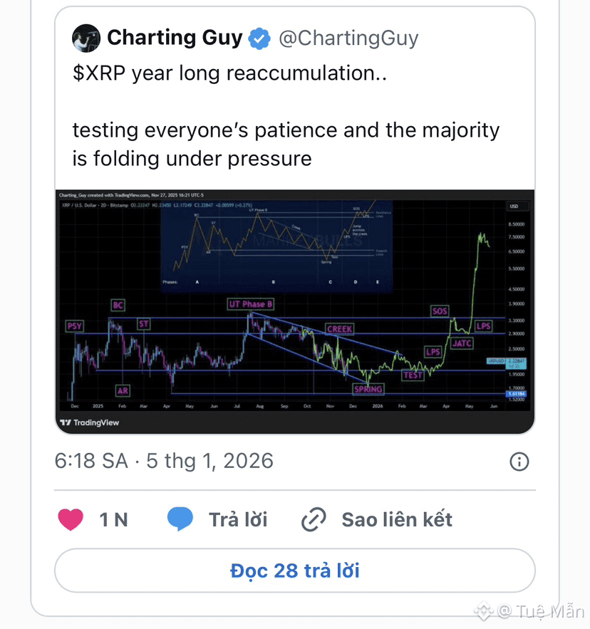 Cuối năm 2025, XRP có thời điểm giảm xuống dưới $1,70 – một “spring below” điển hình theo Wyckoff, trước khi nhanh chóng phục hồi và cho thấy lực bán đã cạn kiệt.